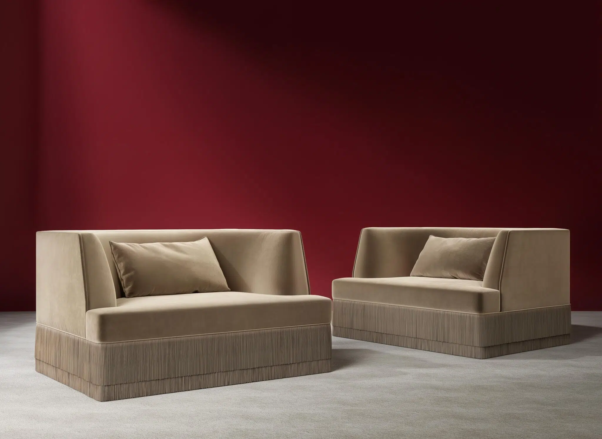 Pink velvet sofa with cushion and fringe design.Pink couch with fringed skirt, modern design.