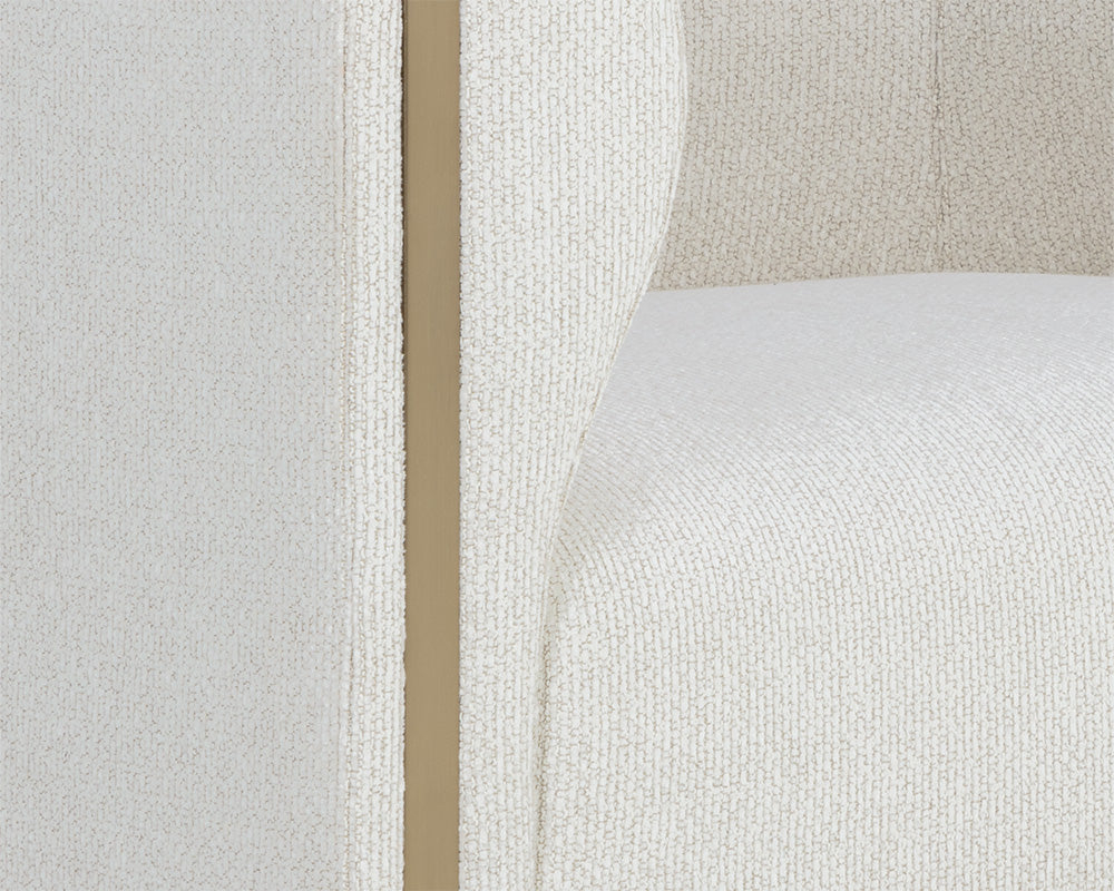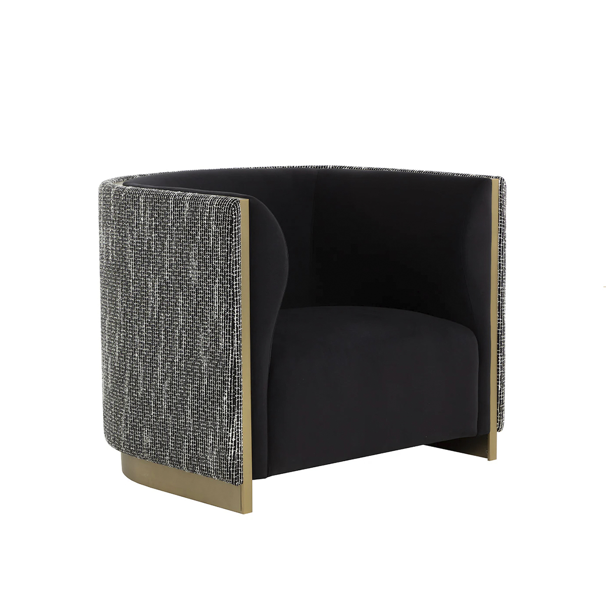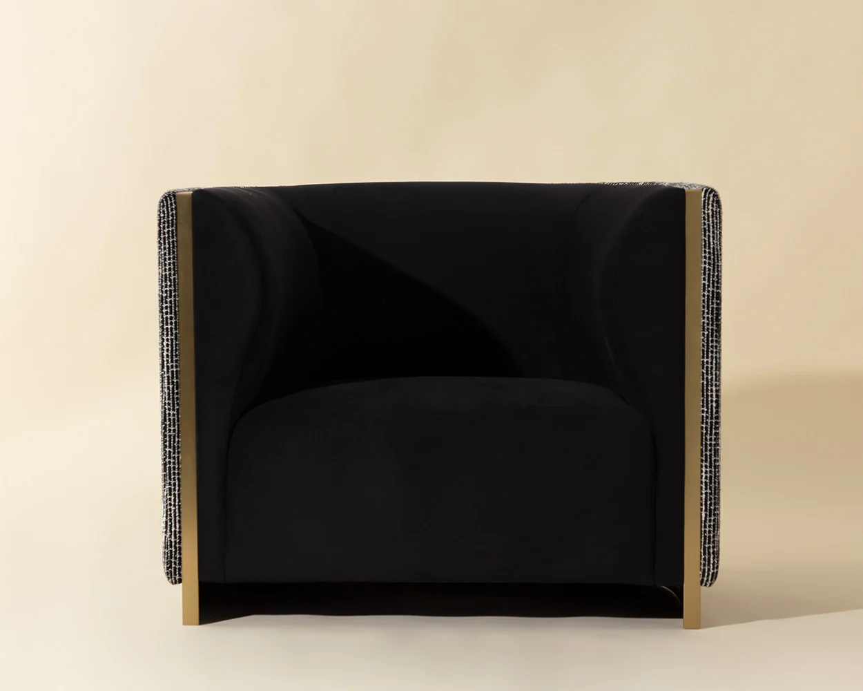 The Abbington Armchair balances mixed materials to bring this contemporary design to life. Expertly upholstered in a two-tone combination of black velvet and textured white black fabric for a mix of contrasting textures. Gold stainless steel metal inlay and padded curves accentuate the chair’s curved silhouette. Performance fabric is moisture repellent, durable and easy to clean.