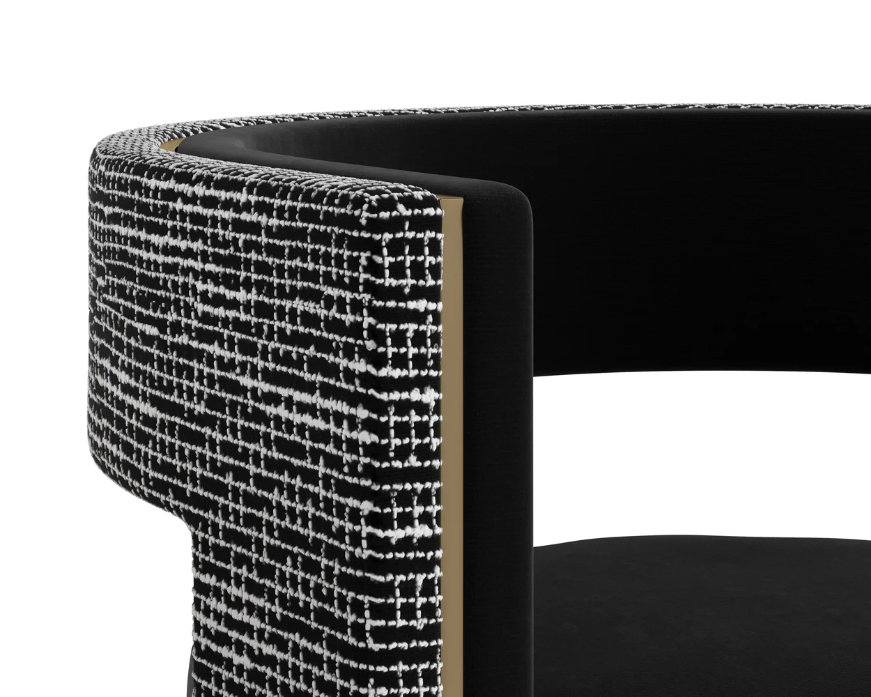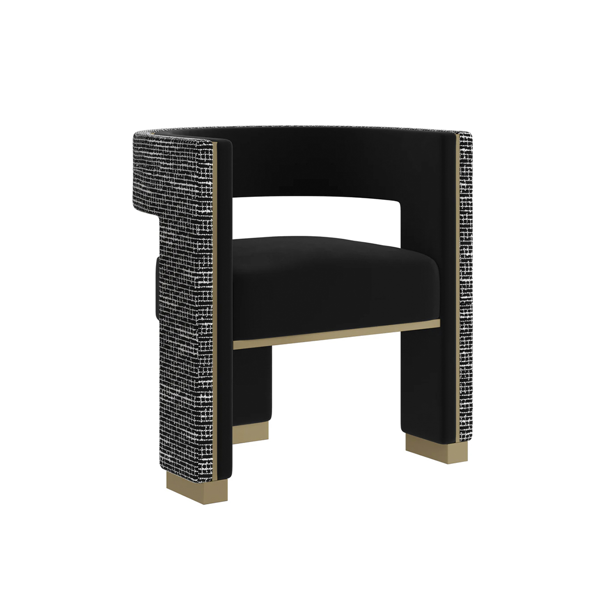 Perfectly poised with a distinct three-legged design, the Abbington Dining Armchair will leave a lasting impression. Powder-coated gold metal detailing enhances the varying textures of the abbington black and hobbes night fabrics for a stylish seating solution.