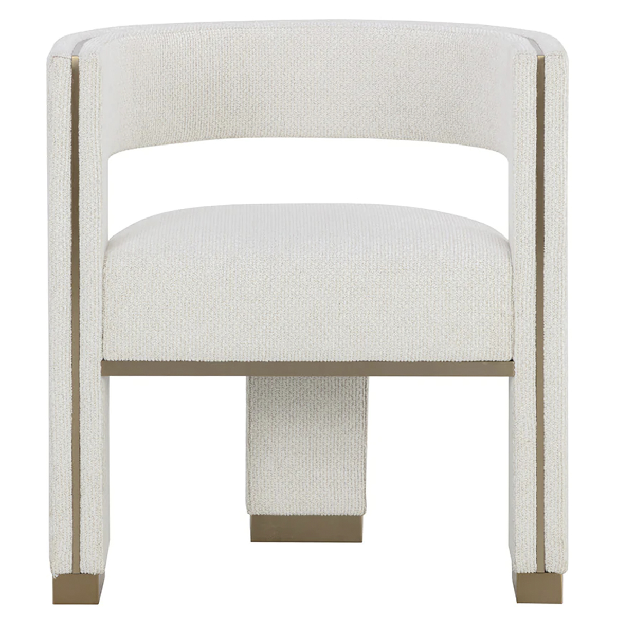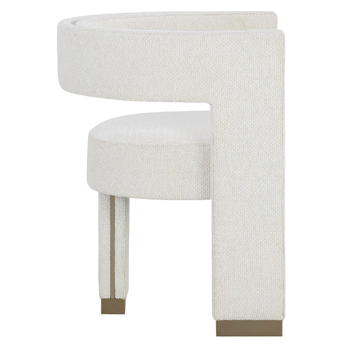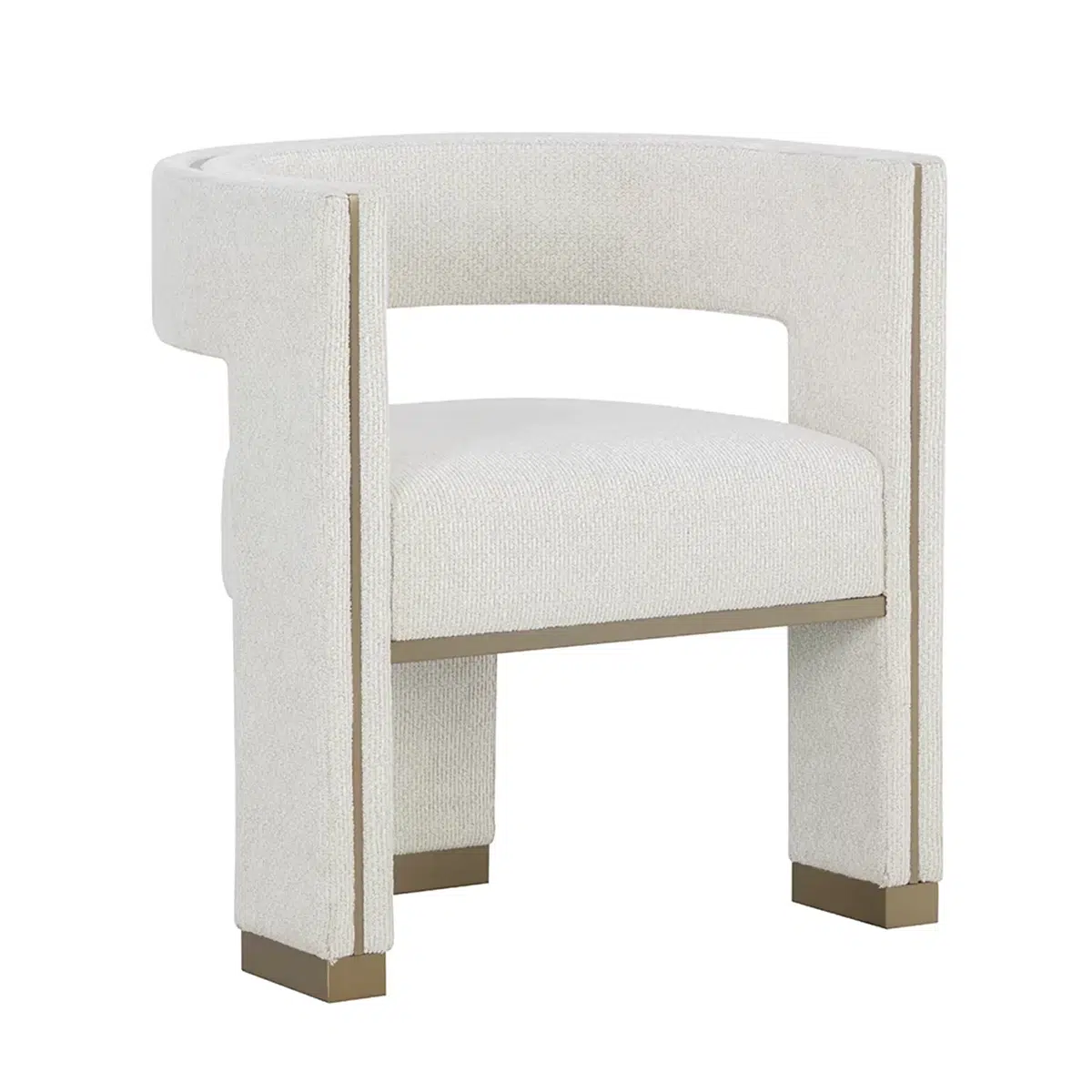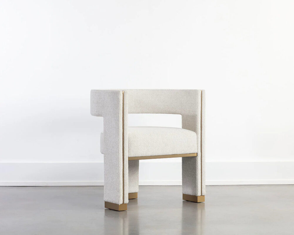 Perfectly poised with a distinct three-legged design, the Abbington Dining Armchair will leave a lasting impression. Brushed gold metal detailing enhances the plush texture of our white performance linen weave fabric for a stylish seating solution.
