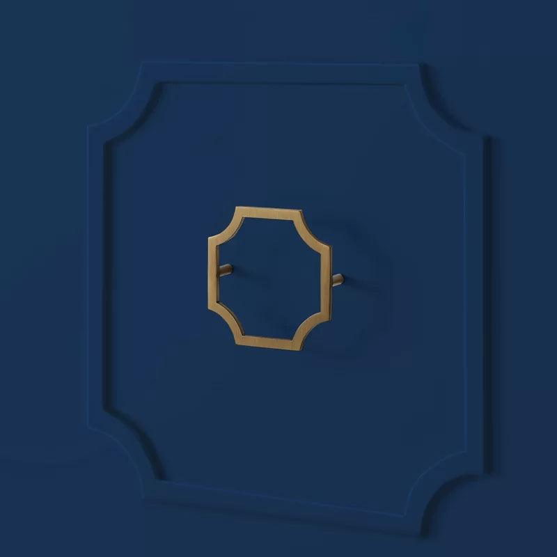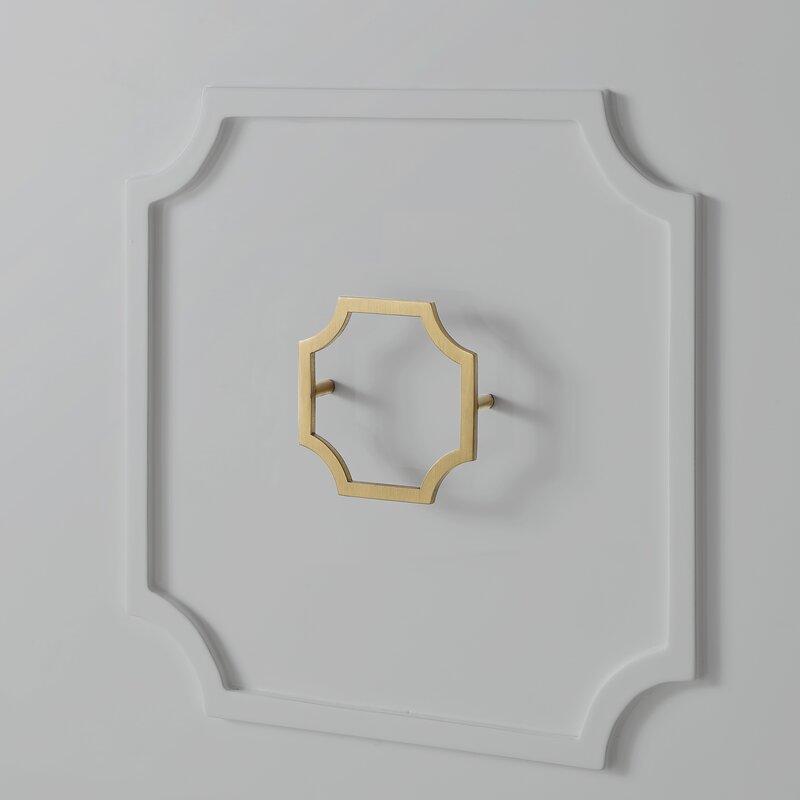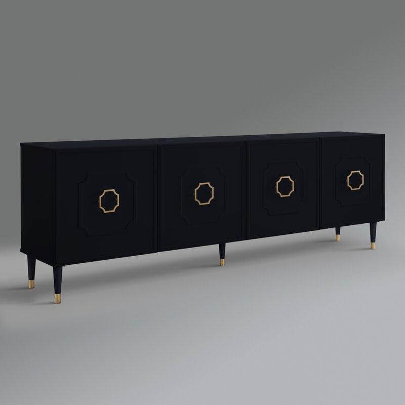 This Adonis White Gold  Cabinet 95.5” wide sideboard brings luxe style to your living room, dining room, or office. It’s made of engineered wood in a gloss finish, and features a rectangular shape, a finished back, and tapered legs. The stainless steel leg caps and octagonal open-framed metal handles have a gold-tone finish, which offers a distinctive contrast. This piece has four cabinet doors, each with trim in a raised octagonal design; each cabinet has two shelves, offering plenty of space for media equipment, dishes and serve ware, or books and files. This sideboard completes the look in any contemporary or glam setting.