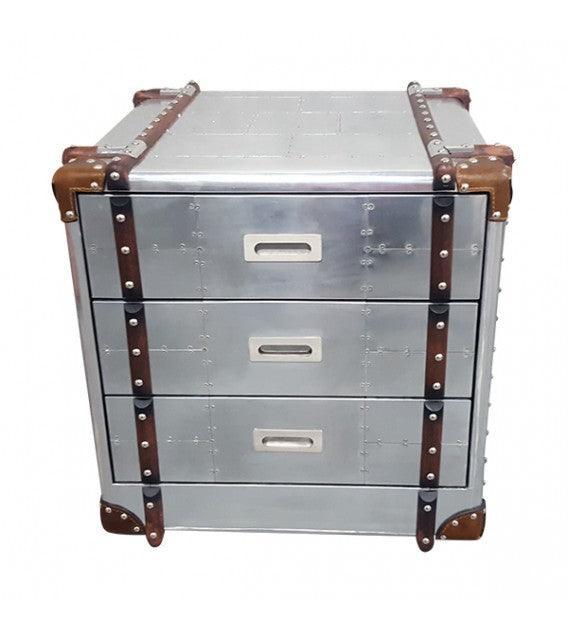 This piece showcases a polished aluminium exterior, which houses three in-built soft close black canvas lined drawers. This striking table can double as a luxurious addition to any bedroom or a versatile side table in any setting.