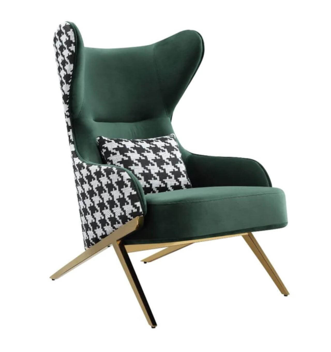 Alamode Green Velvet Houndstooth Gold Wing Chair