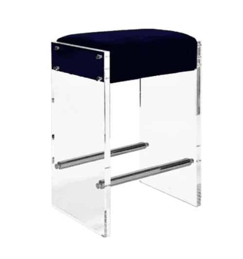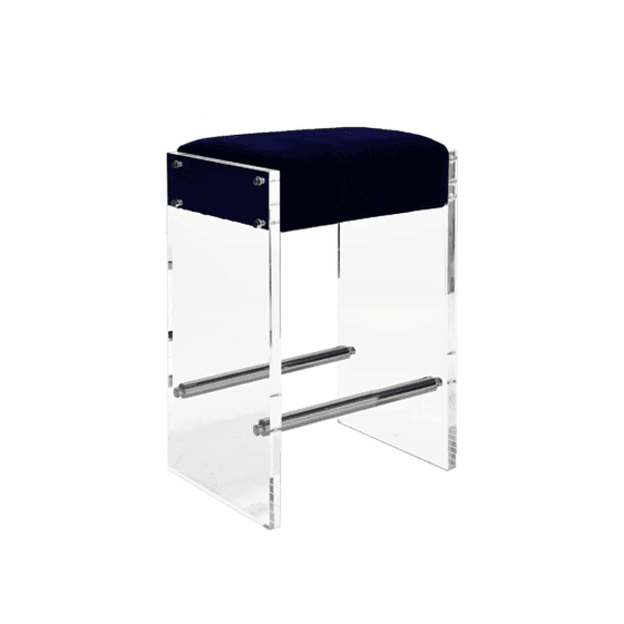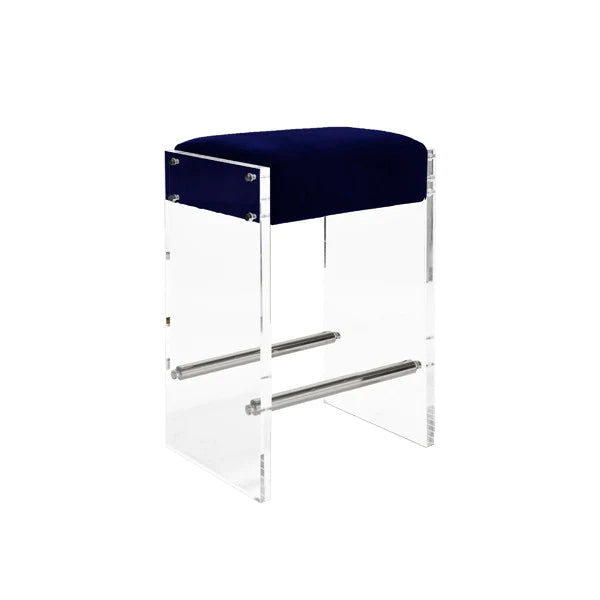 ACRYLIC PANEL COUNTER STOOL WITH NICKEL ACCENTS & NAVY VELVET CUSHION