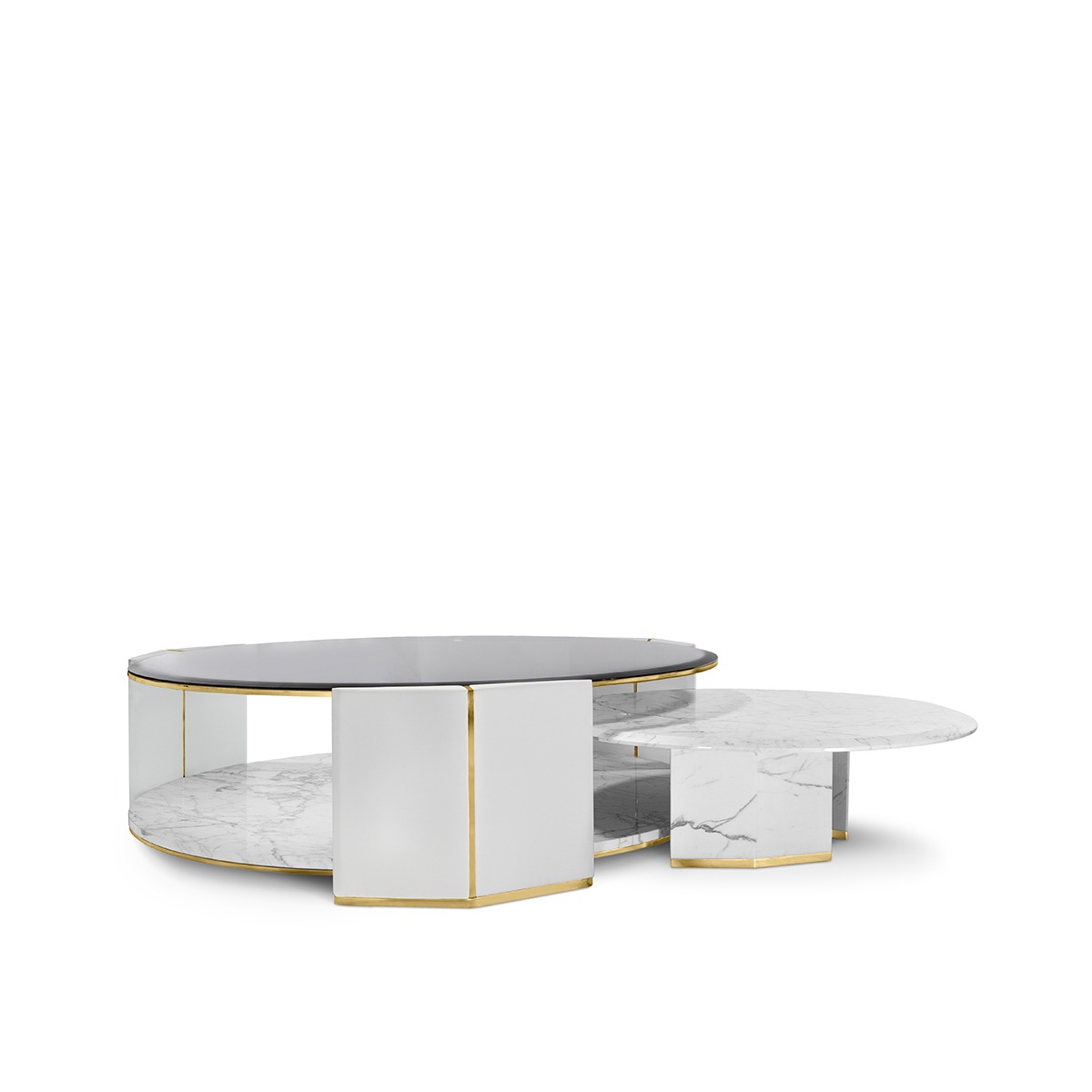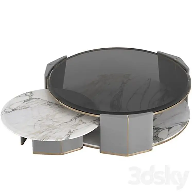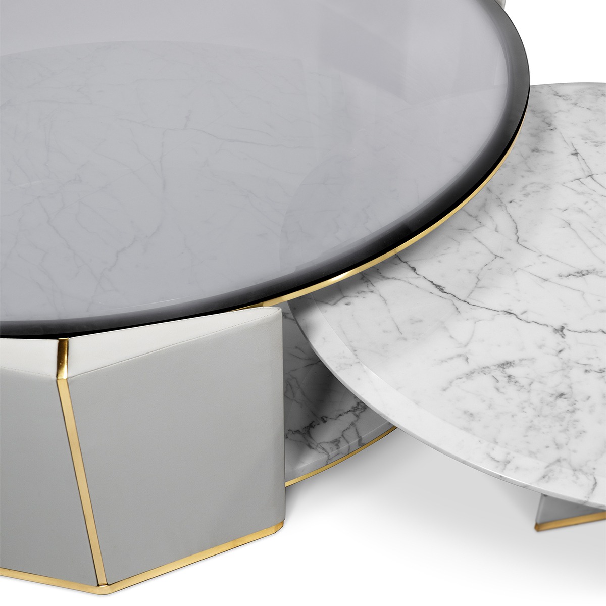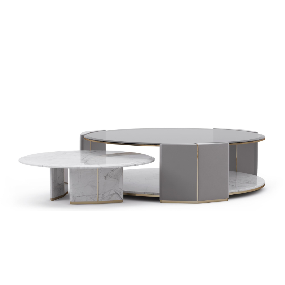 Algerone Marble Grey Leather Coffee Table Set. A Large And Small Table Gives A Sleek Appearance With Its Statuario Marble And Gray Leather Design. The Smoked Glass Top And Polished Brass Accents Complete The Ultimate Quality.