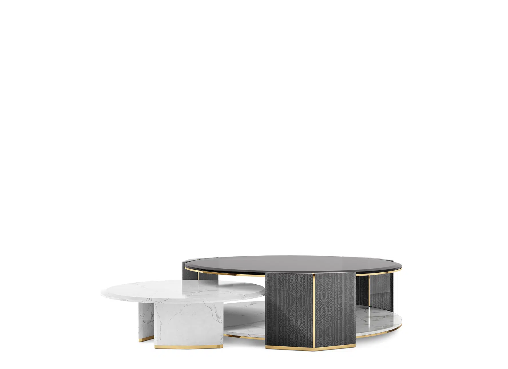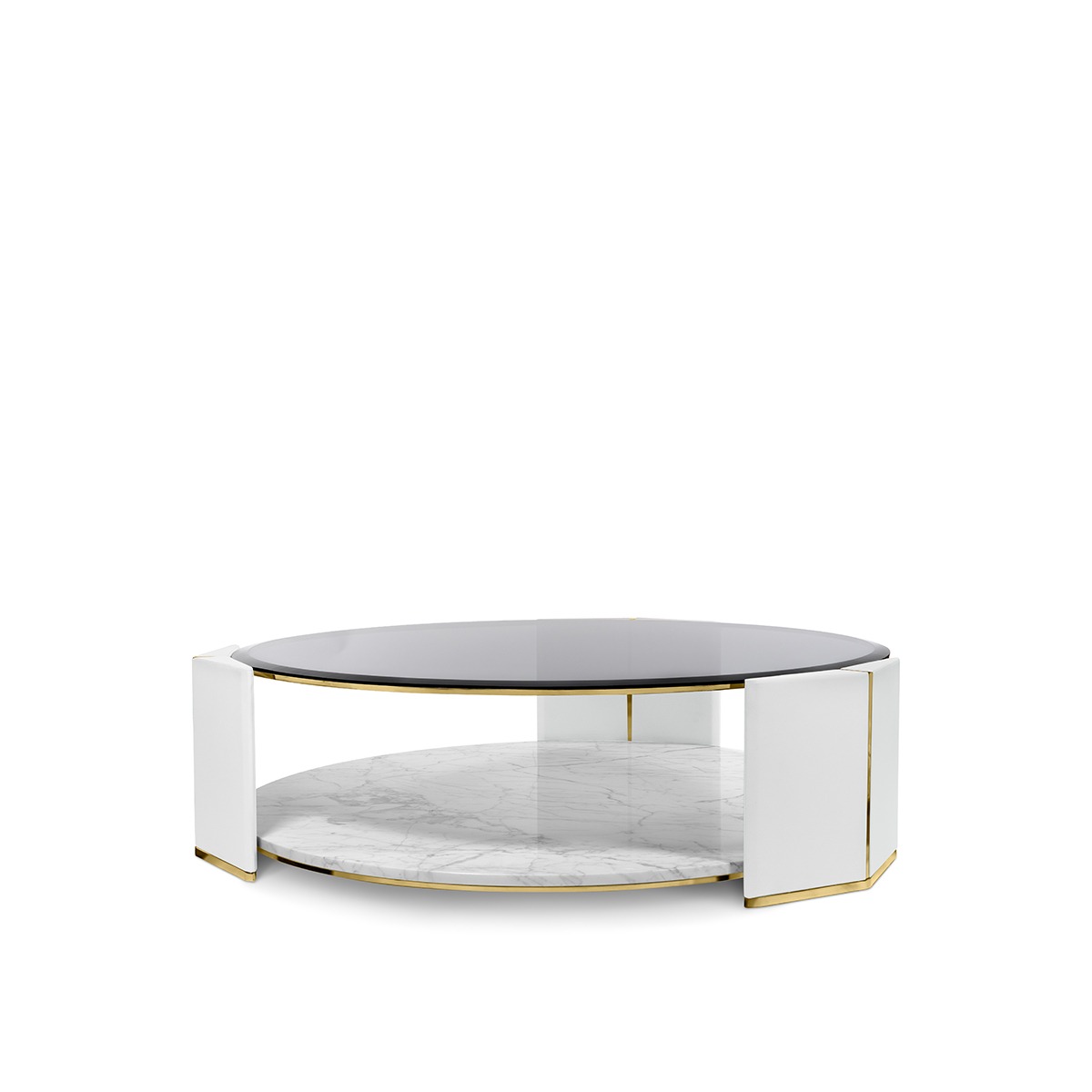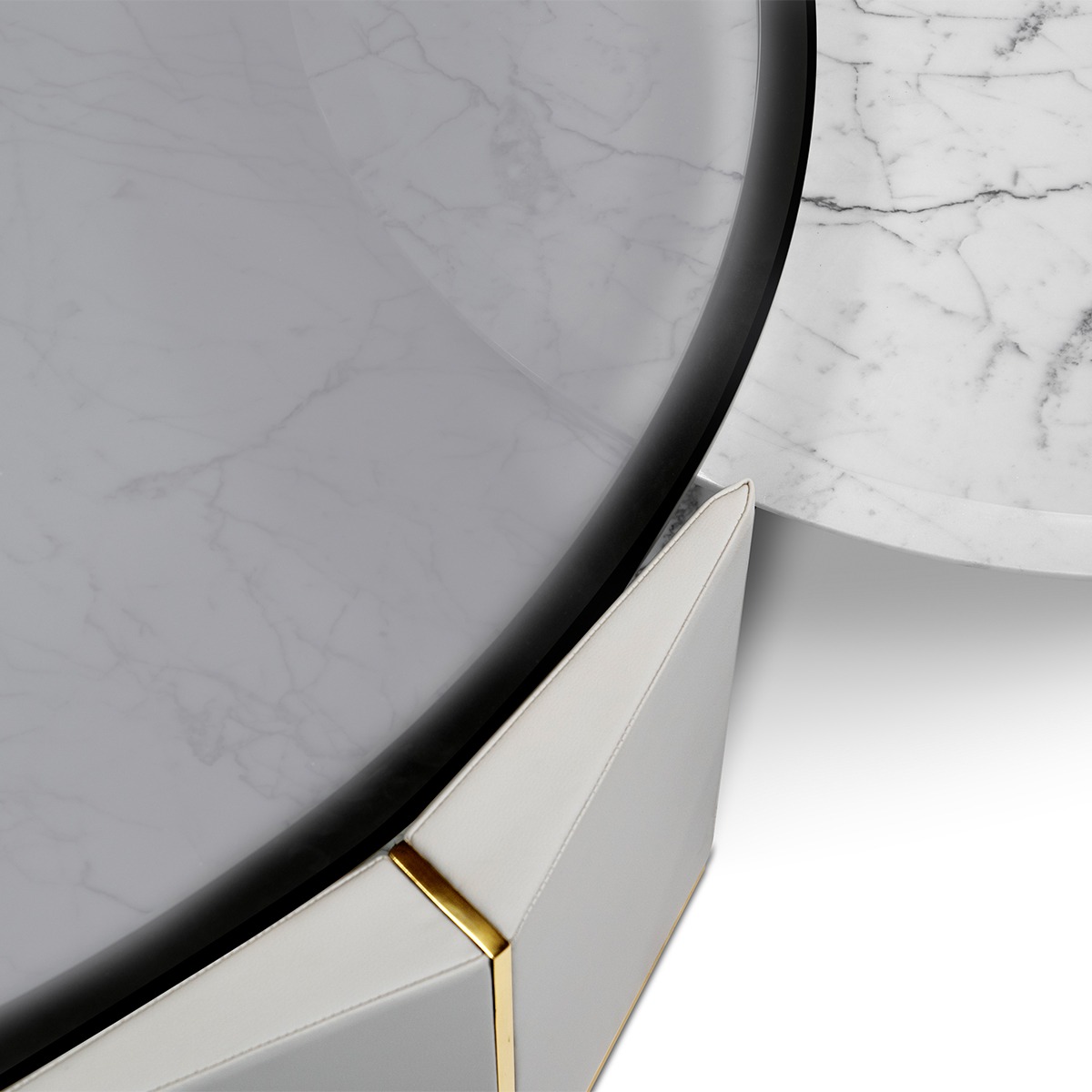 Algerone Marble Grey Leather Coffee Table Set. A Large And Small Table Gives A Sleek Appearance With Its Statuario Marble And Gray Leather Design. The Smoked Glass Top And Polished Brass Accents Complete The Ultimate Quality.