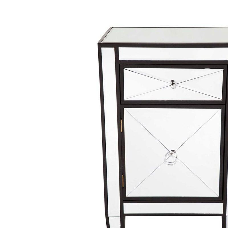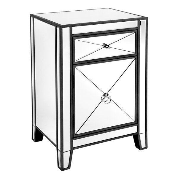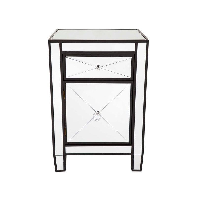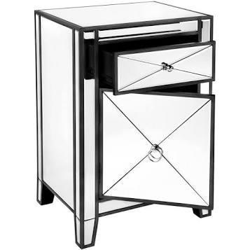 Apollo Black Mirror Bedside Cabinet. The Apollo Bedside Table embraces the nostalgia of Hollywood and mixes it with contemporary lines and a fresh new look, including inlaid diamond panels and polished chrome handles offset by dramatic black trim. Think luxe black or charcoal velvet, silver accents and crystal lighting.