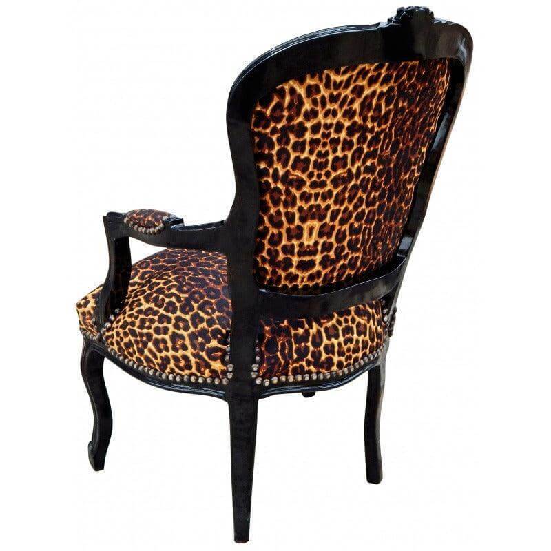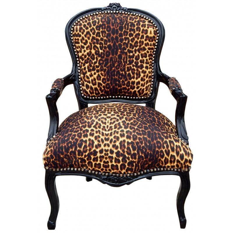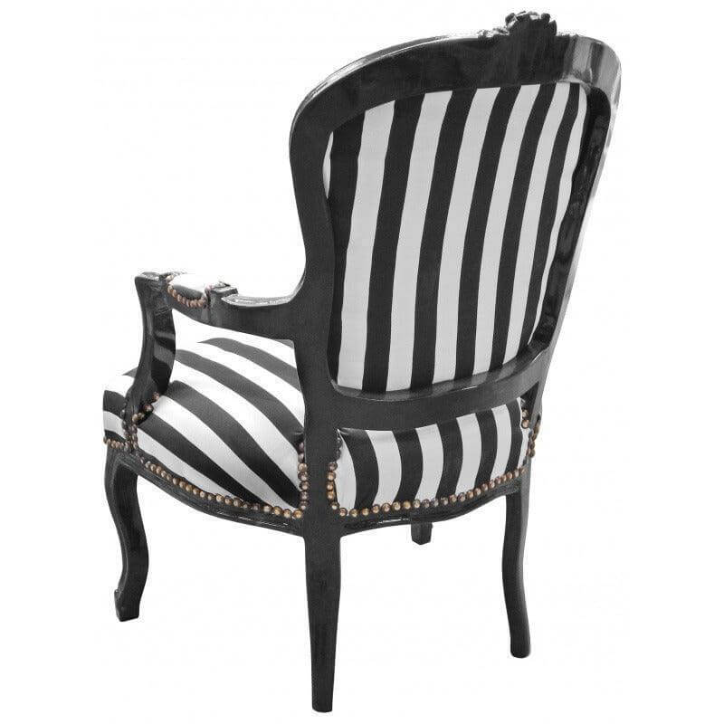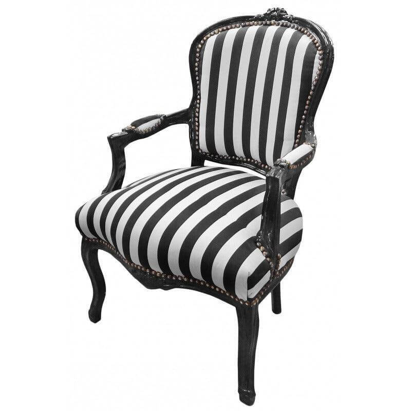 This baroque armchair Louis XV style has a beautiful fabric in black and white striped cotton with a perfect comfort. The fabric is nailed to the frame and wood color is made with painted black. The seat is very comfortable and soft, made in the traditional way (design: straps and strips covered with white fabric). Wood (beech) is finely hand carved by our craftsmen to various reasons resuming style.