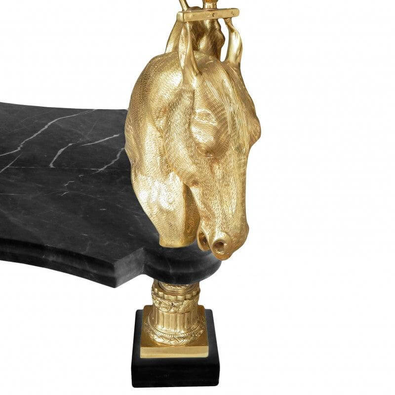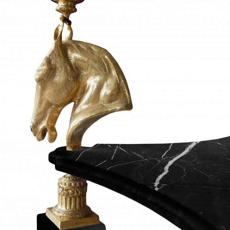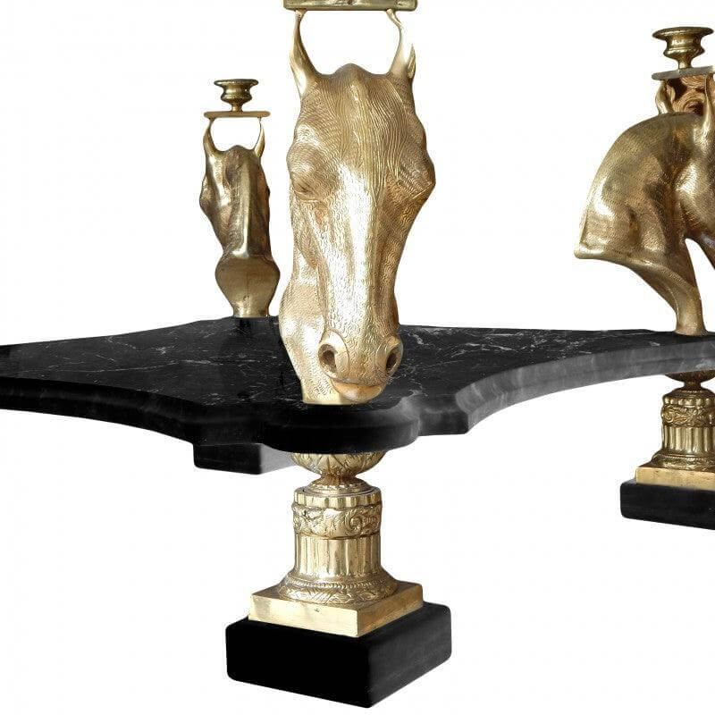 Fantastic round dining table with glass top and gold horses decoration. The tray below is black white marble veined . A great piece of work by our master craftsmen. Absolutely everything is hand-carved. This table is absolutely fantastic and very rare, a perfect realization.