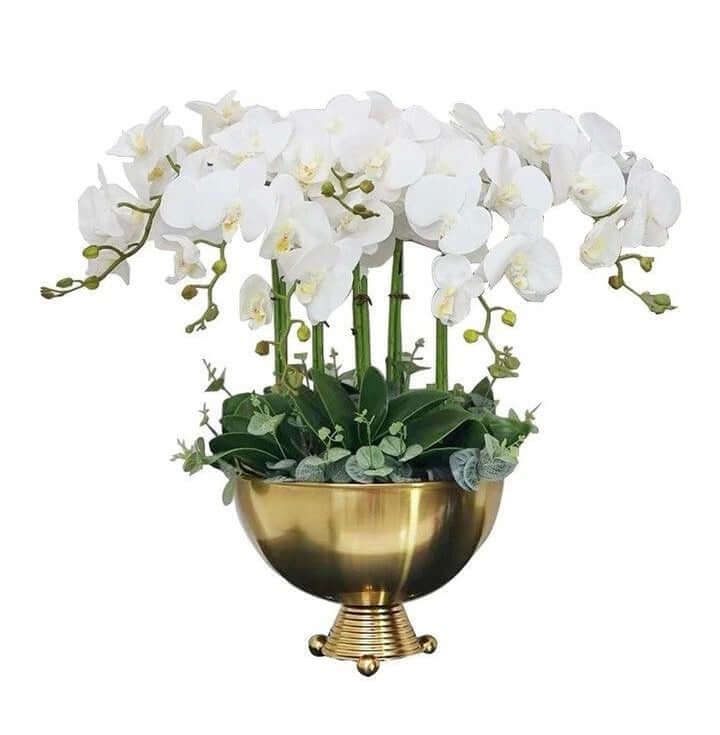 Luxury polsihed brass planter with Artificial Orchid centrepiece Floral Arrangement in Large Triangle footed bowl in brass finish.