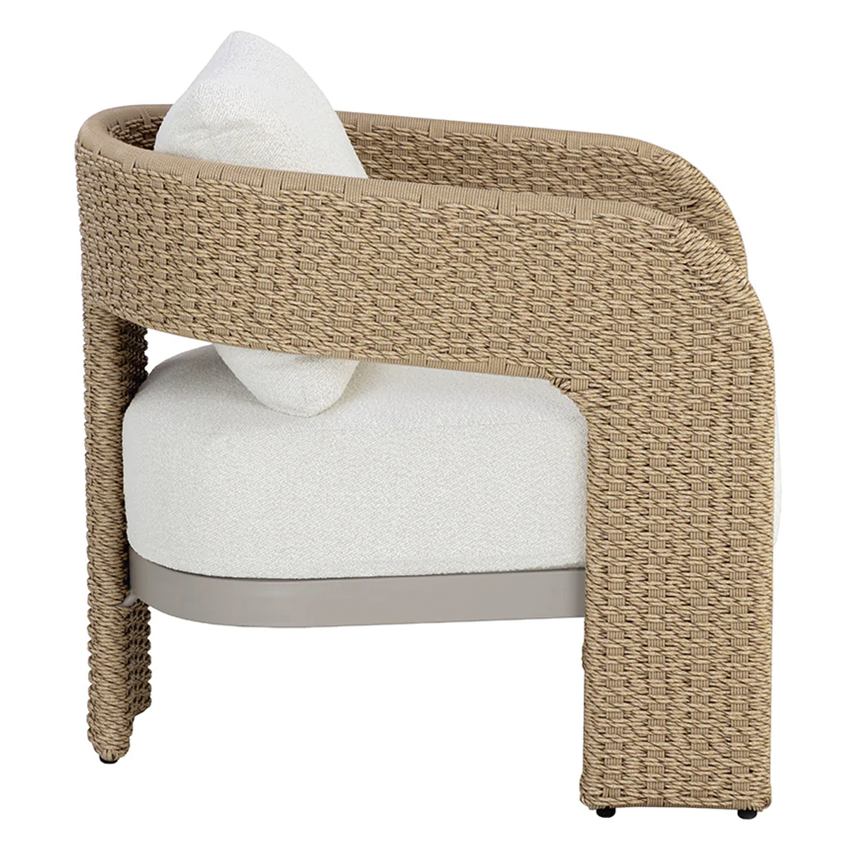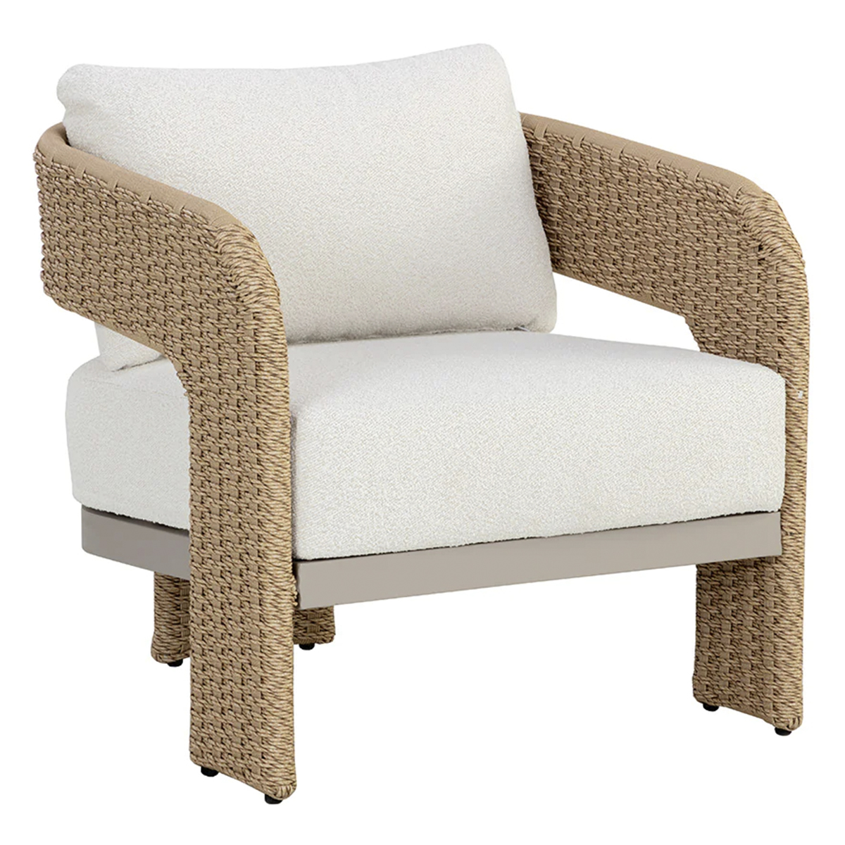 The geometric curves of the Bahama Lounge Armchair will effortlessly stand out in any outdoor area. Twisted wicker in a natural finish wraps around an weatherproof aluminum frame for a defined, textured look. Soft cushioning in our white woven outdoor performance fabric ties the look together. Performance fabric is moisture repellent, durable and easy to clean.