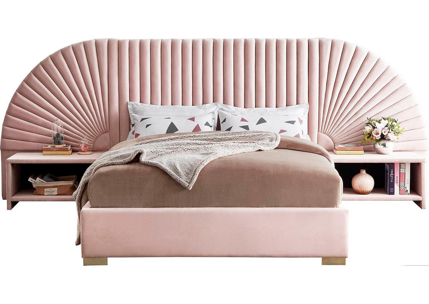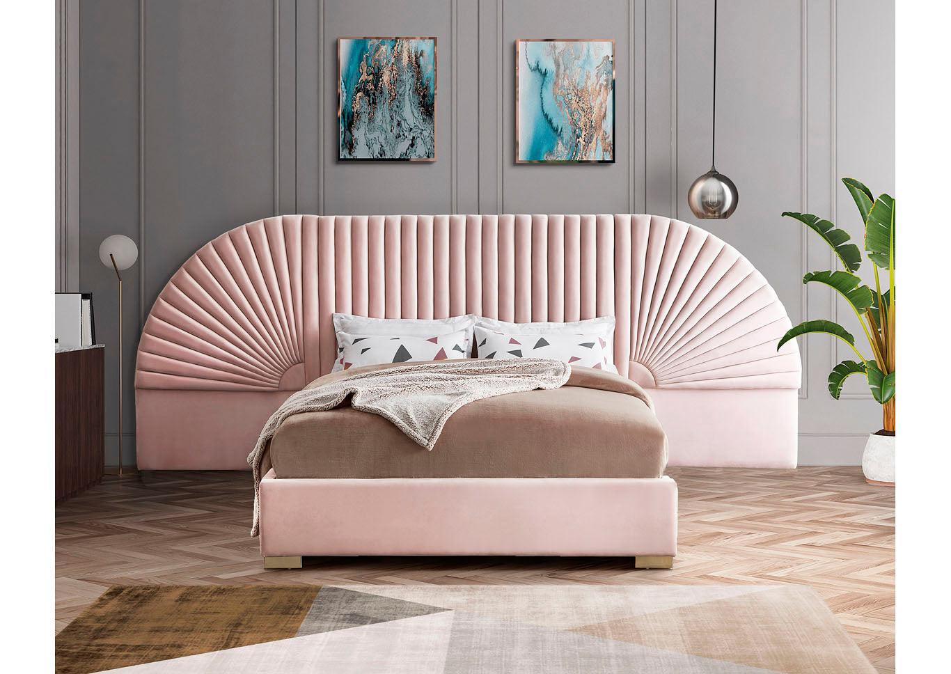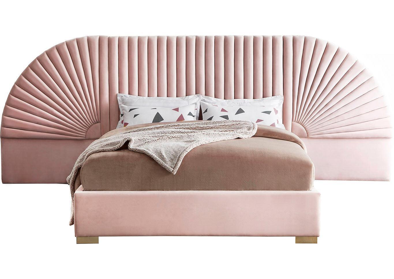 The Balmoral Collection by Avant Garde Furniture is a truly elegant and eye-catching design. Enjoy sweet dreams in this beautiful Balmoral velvet Queen, King, Super King size bed. The tall, luxurious velvet headboard is upholstered in a channel-tufted style, flanked by removable fan-shaped side pieces. The footboard and rails are comfortably upholstered in soft velvet as well, with gold steel legs supporting the frame. Matching pieces are available in the same collection, allowing you to complete the contemporary style of this look for an elegantly glamorous bedroom.