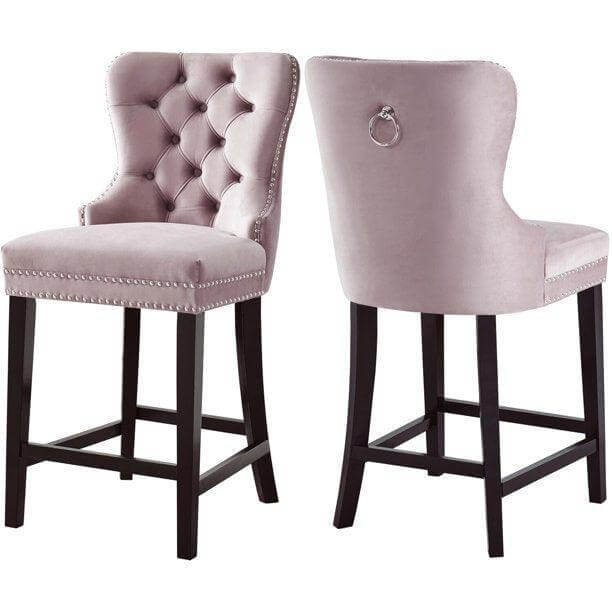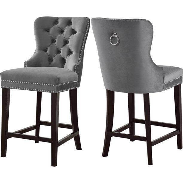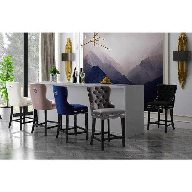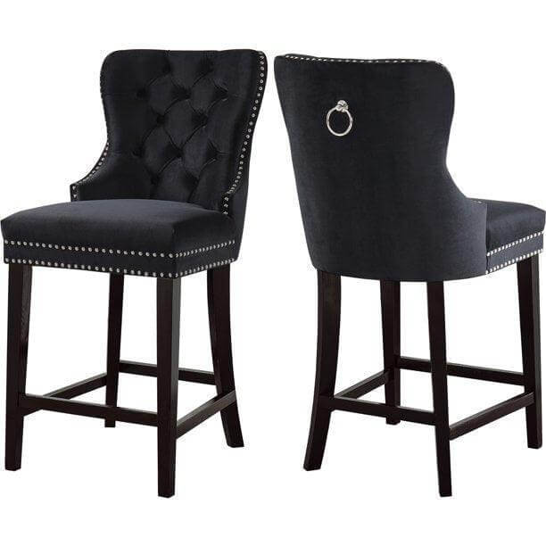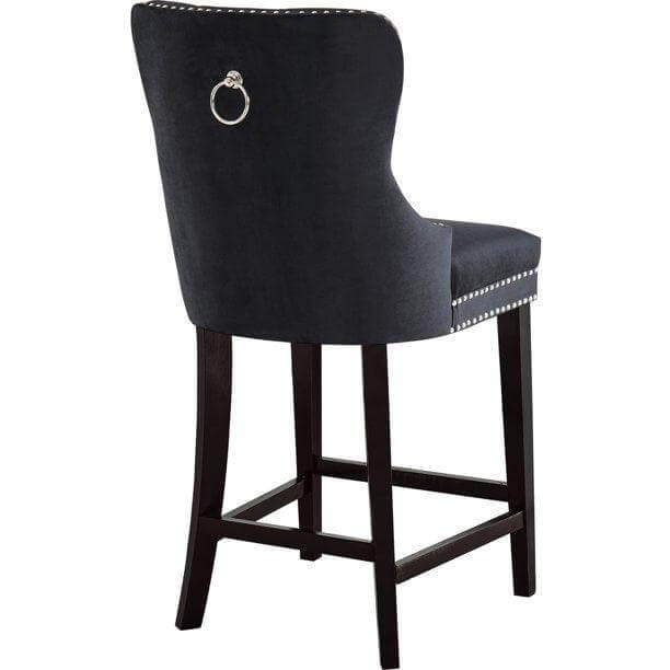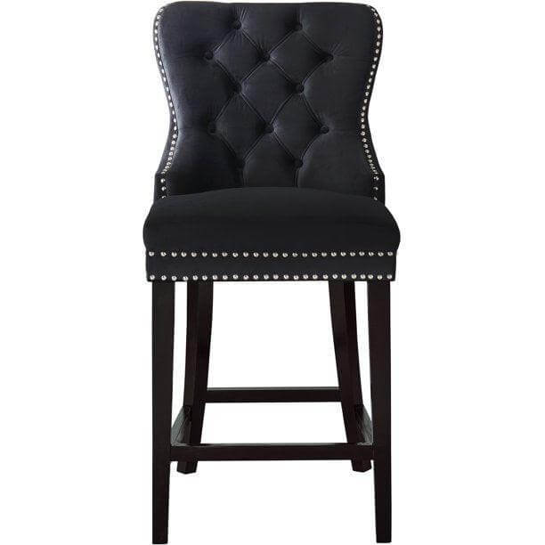 Lounge in luxurious style with the Baltimore velvet counter stool. Featuring a curved high back, plush cushioned seat and deep tufted velvet upholstery studded with chrome nailheads, this counter stool is sure to take your dining experience to a whole new level. Solid ash black wood legs provide sturdy support and complement the stunning black upholstery for a sleek, contemporary design.