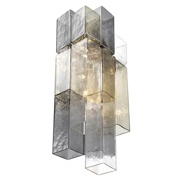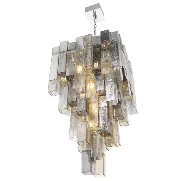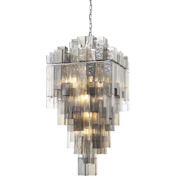 Balustrade Smoked Glass Nickel Chandelier takes inspiration from the stepped square balusters found on grand staircases. It features square frames boasting elongated tubes of smoke glass. These tiered elements create a mesmerizing visual effect, with varying lengths and densities that add depth and intrigue to your space. Varying lengths, tones and densities of glass influence the depth and color of light.