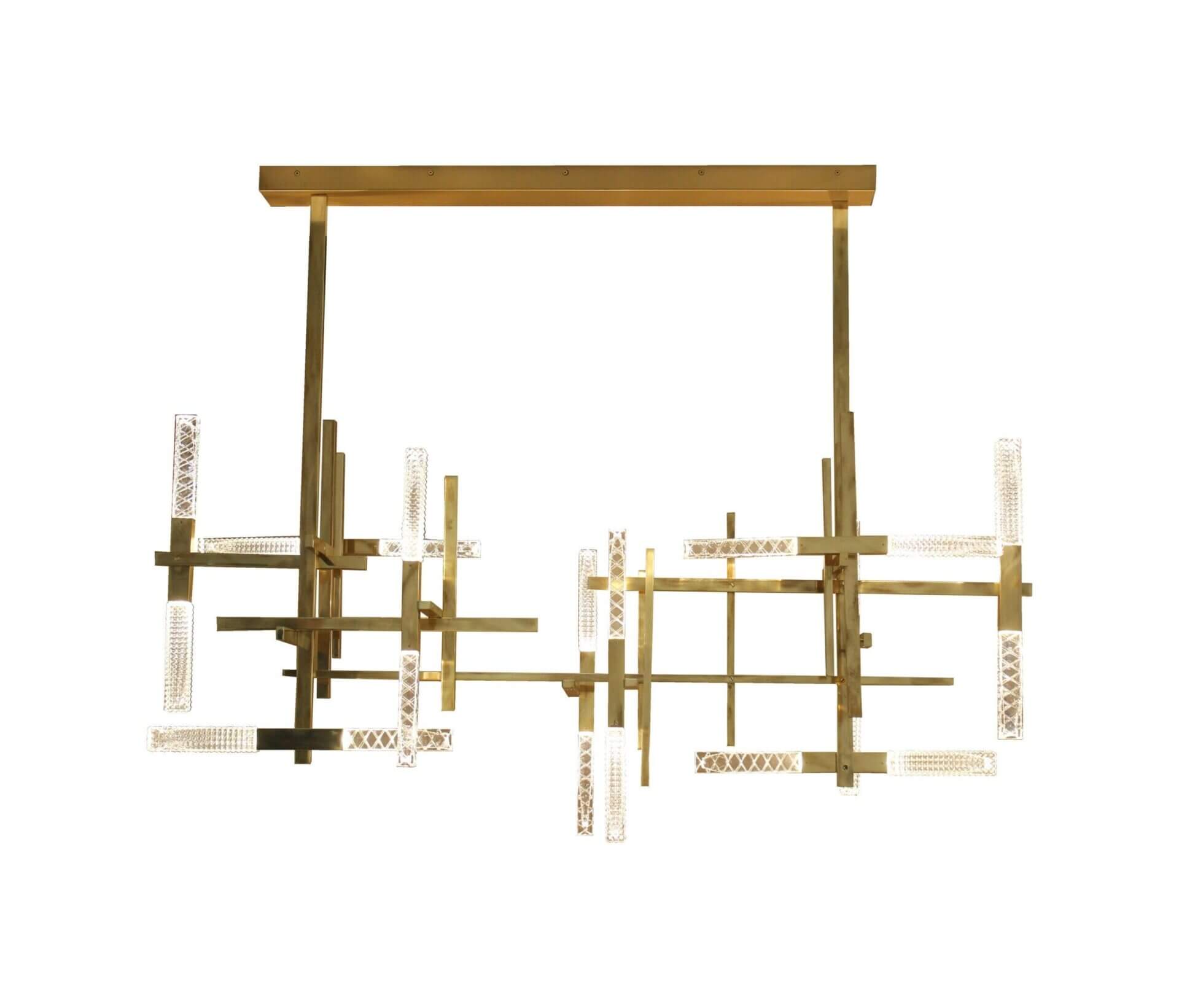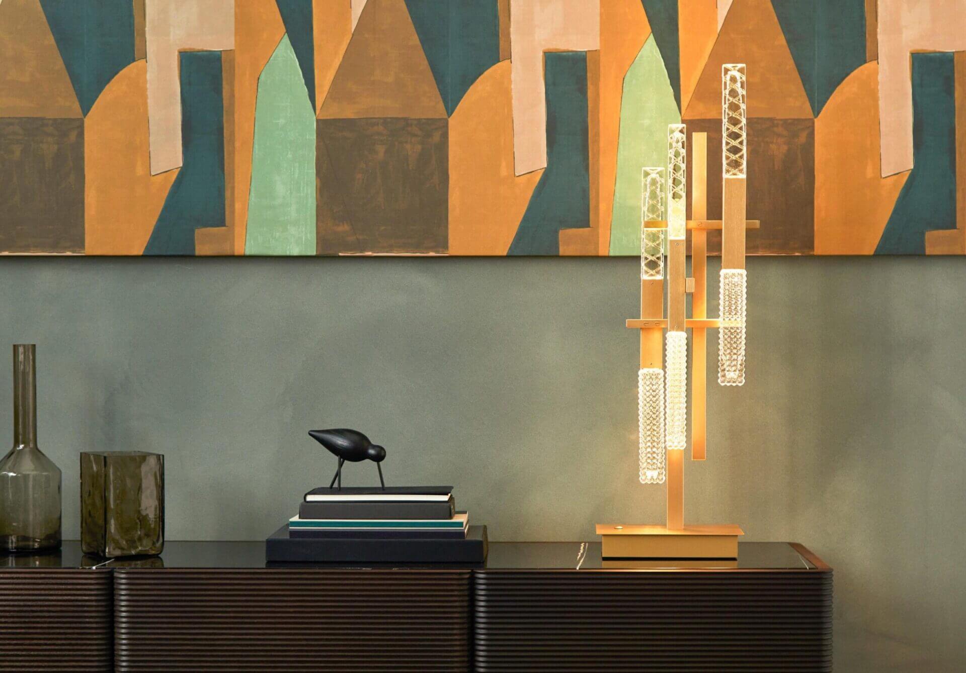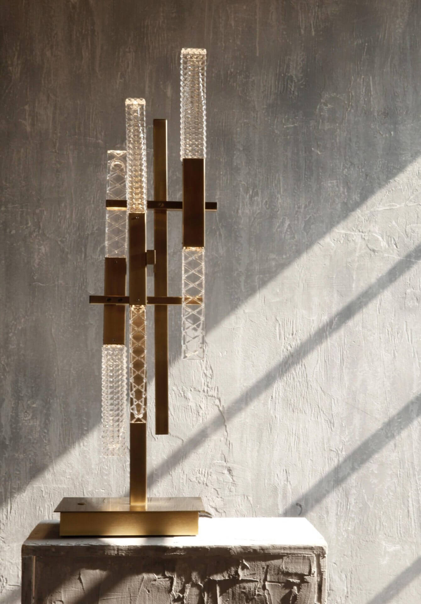 A collection of “jewel” lamps characterised by the combination of rectangular brass tubes and slanted cubes in engraved crystal, with two types of workmanship. The apparently random juxtaposition in fact follow a precise and balanced scheme. The LED sources, inserted in the tubes so as to showcase the preciousness of the crystal,