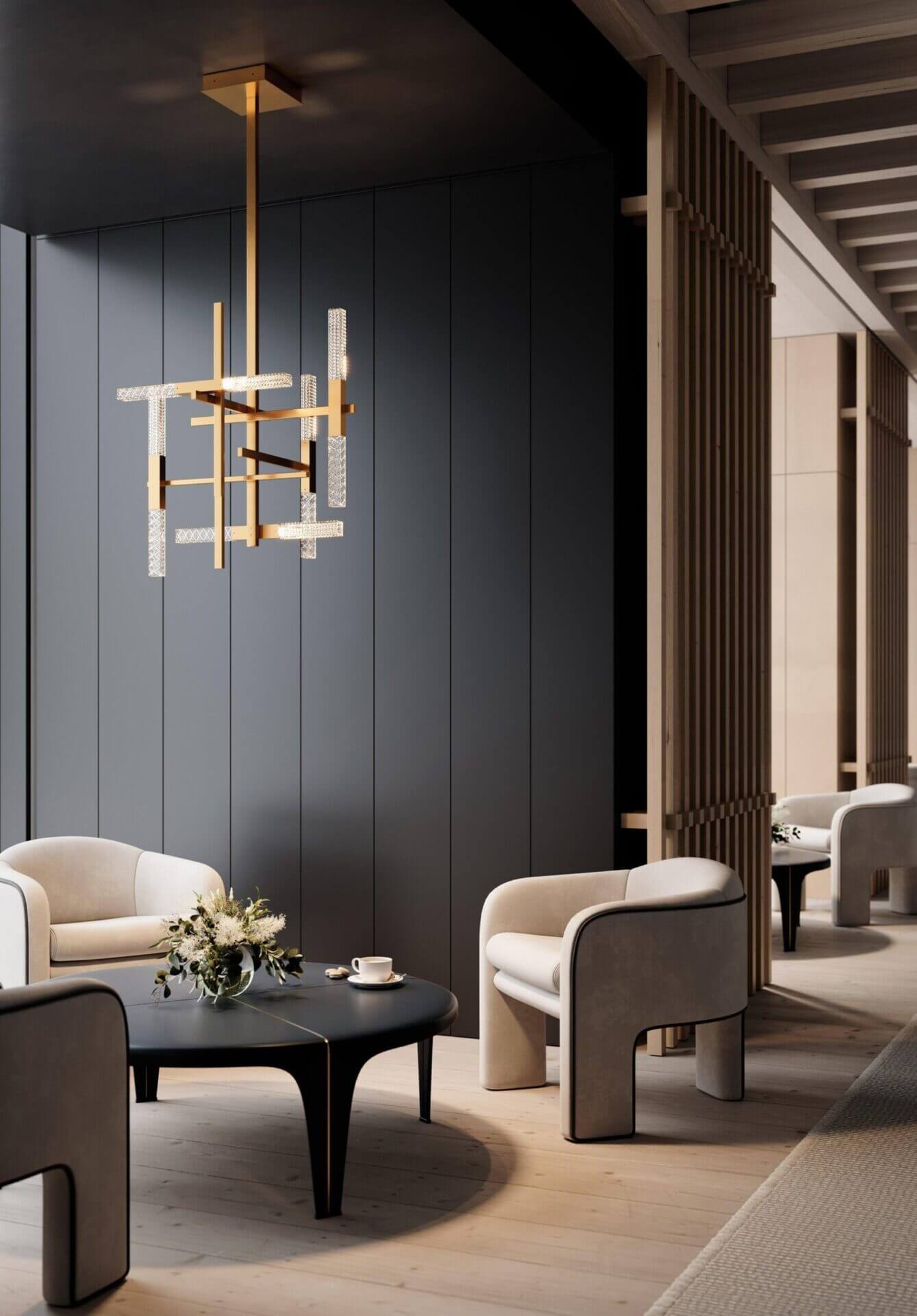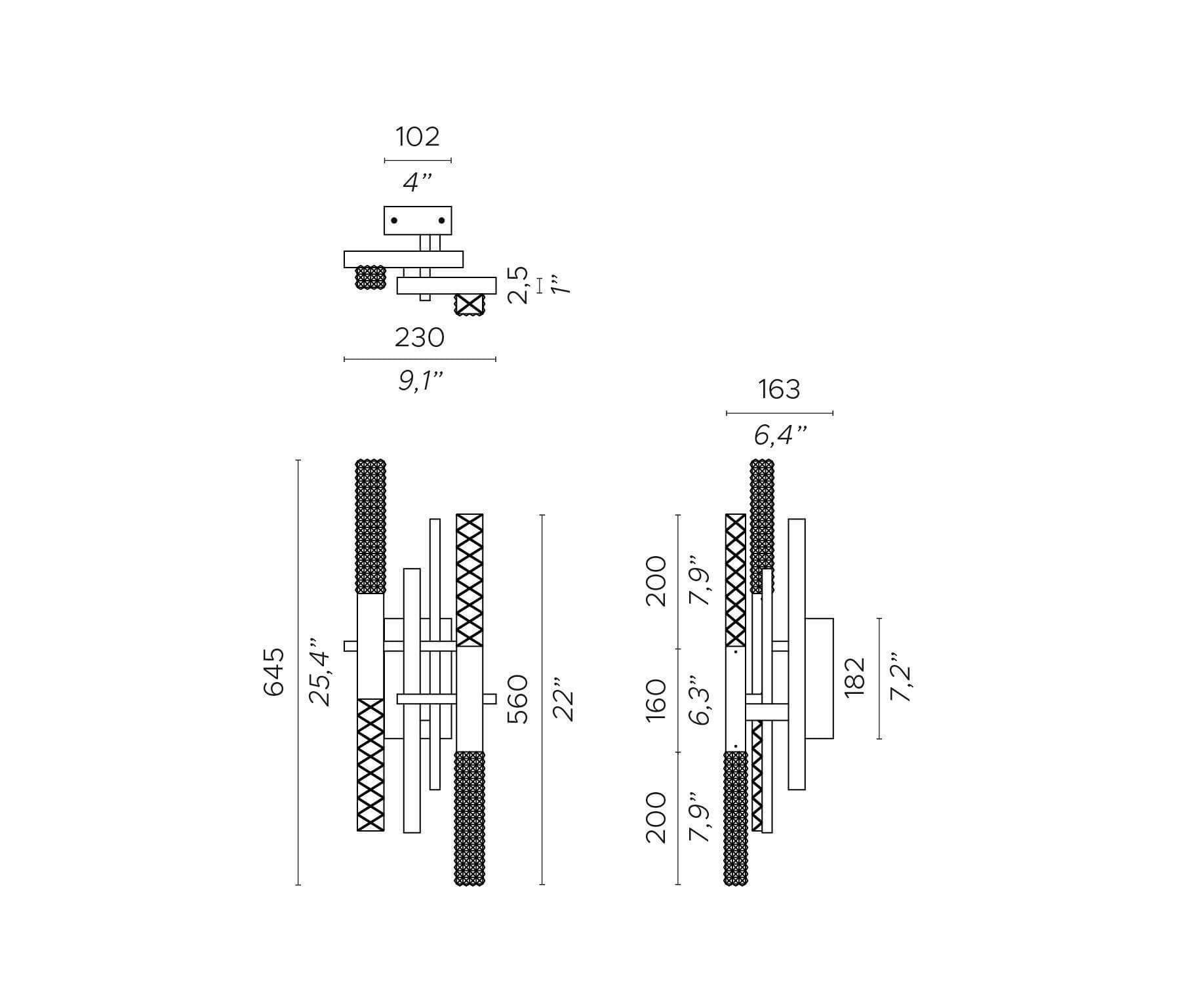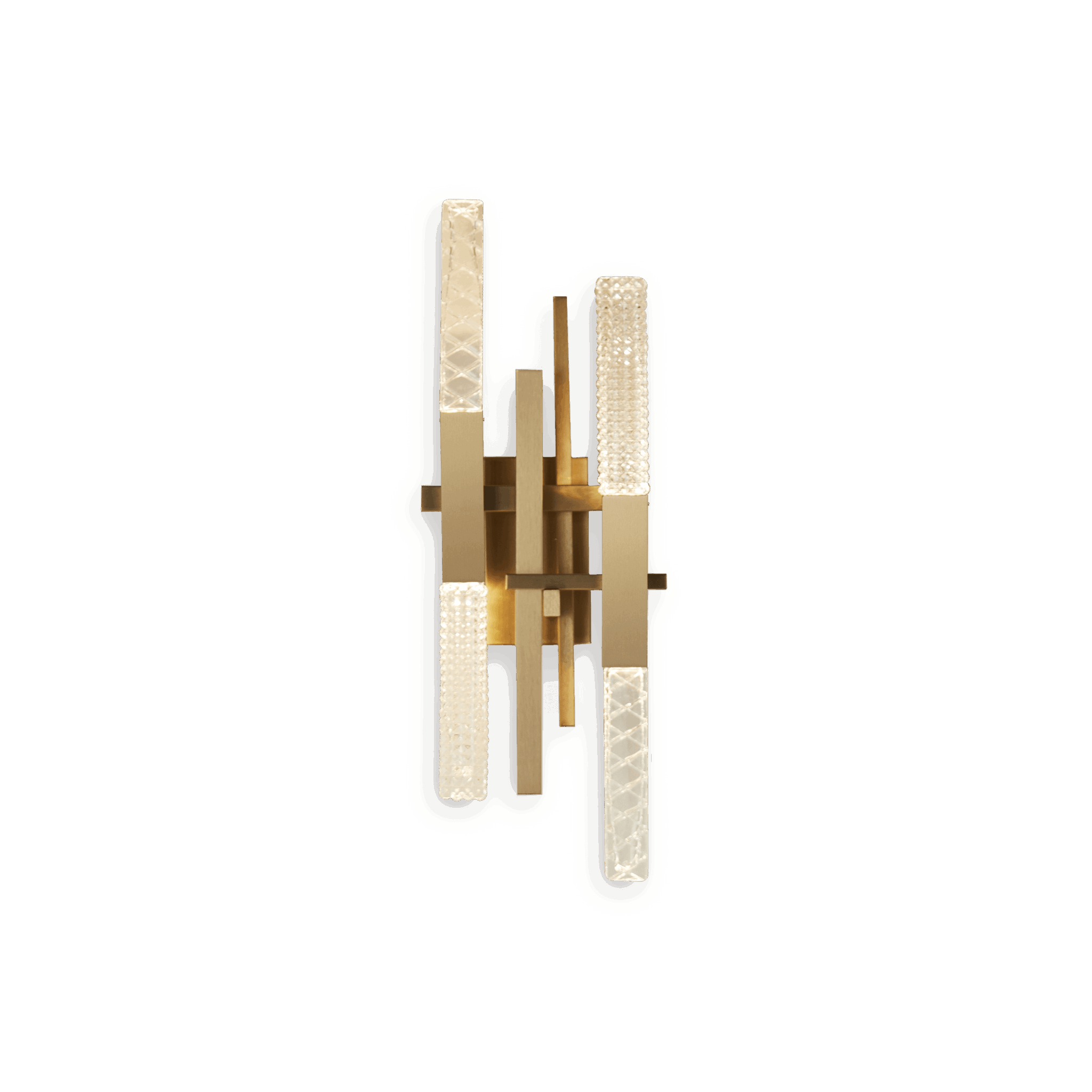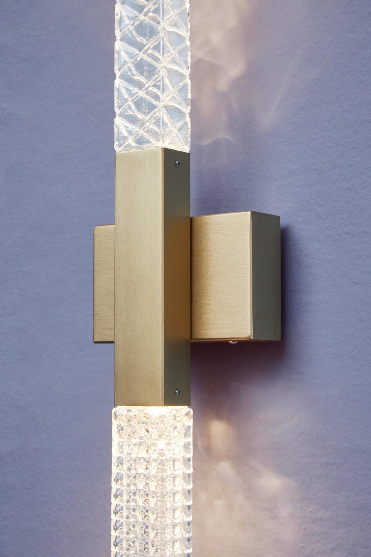 A collection of “jewel” lamps characterised by the combination of rectangular brass tubes and slanted cubes in engraved crystal, with two types of workmanship. The apparently random juxtaposition in fact follow a precise and balanced scheme. The LED sources, inserted in the tubes so as to showcase the preciousness of the crystal,
