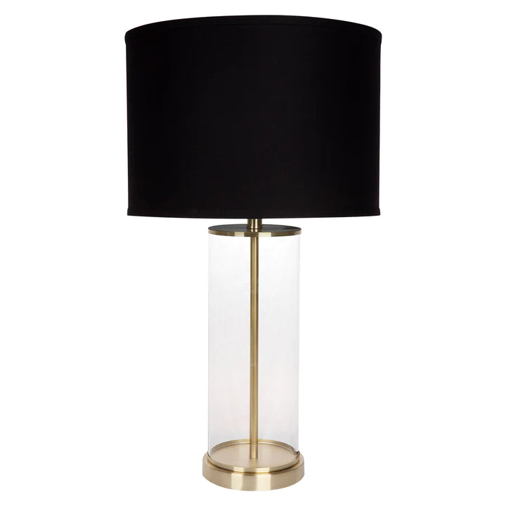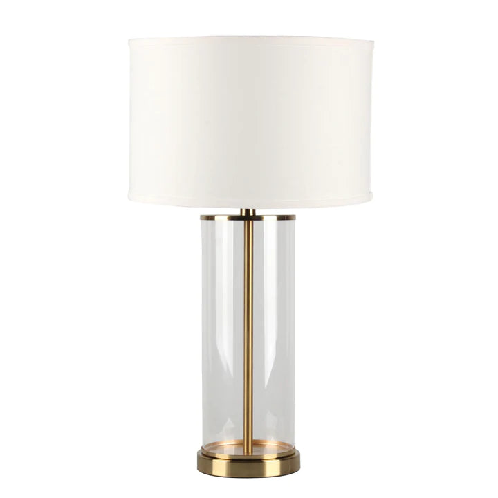 The Bank Table lamp is a modern glass table lamp and would be a sleek addition to any space. Features a brass finish metal rod encased in a clear glass cylinder base trimmed with matching brass metal. Topped with a white linen drum shade.