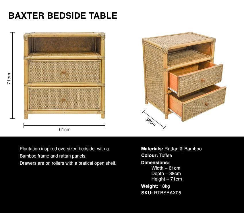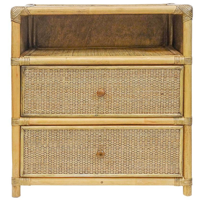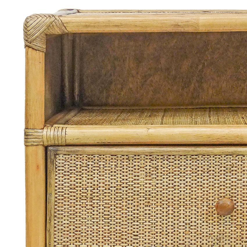 Plantation inspired bedside table with a bamboo frame and rattan panels. Drawers are on rollers, and the open shelf allows for easy access