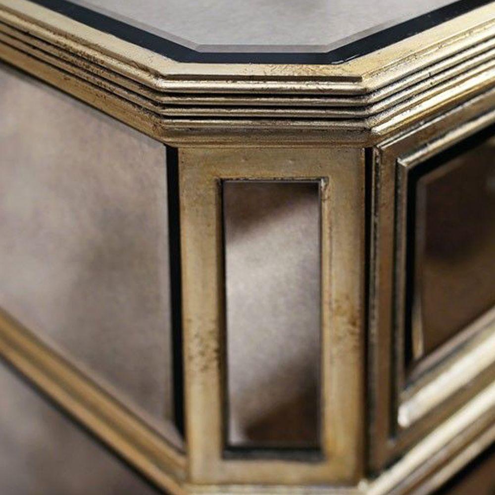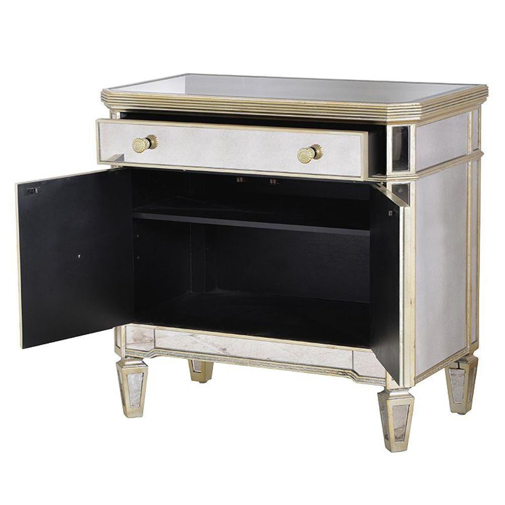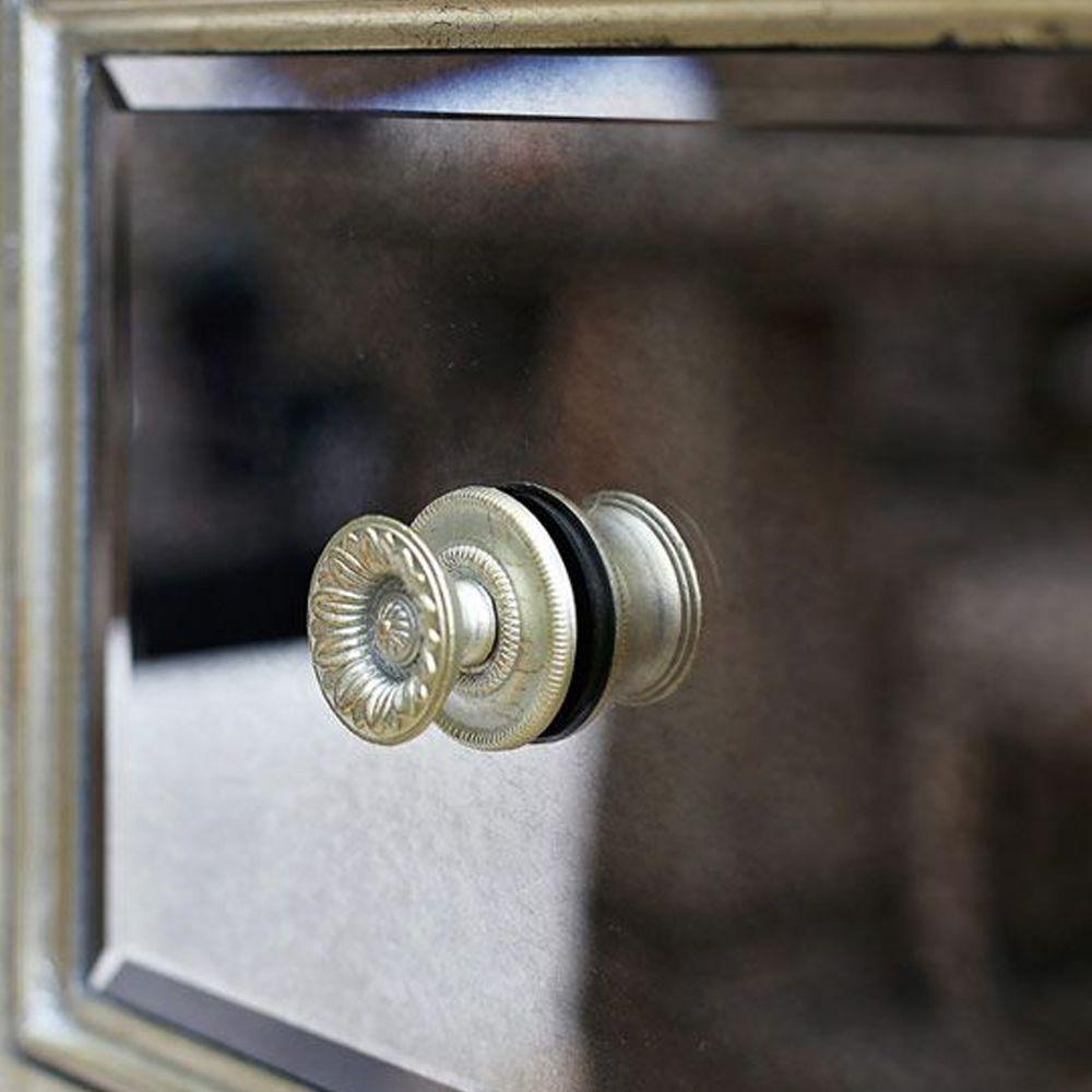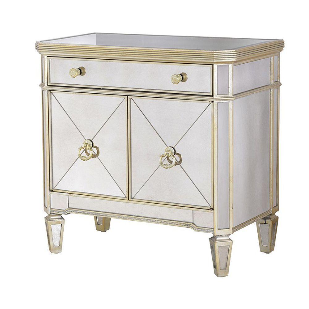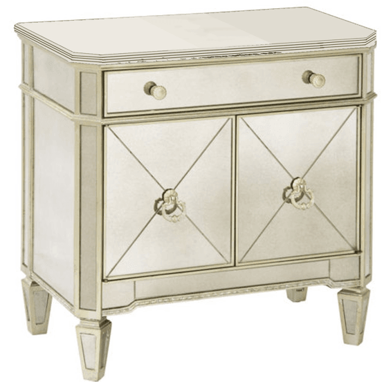This mirror piece with a bevelled cross design in the glass is encased in an antique gold leaf trim to provide an authentic patina. One drawer, two doors and internal shelf provide ample storage and make it a versatile piece for a bedroom or entrance. Take greater advantage of the reflective benefits of mirrors by incorporating a statement mirrored furniture piece. Our Cabinet embraces the glamour of Hollywood and Art Deco inspiration. The nostalgic design features mirrored panels, with antiqued champagne mouldings and hardware. Keep the room restrained for a Manhattan style, or add a touch of Paris with French inspired furniture and heavy accents of gold or silver in mirrors and accessories.