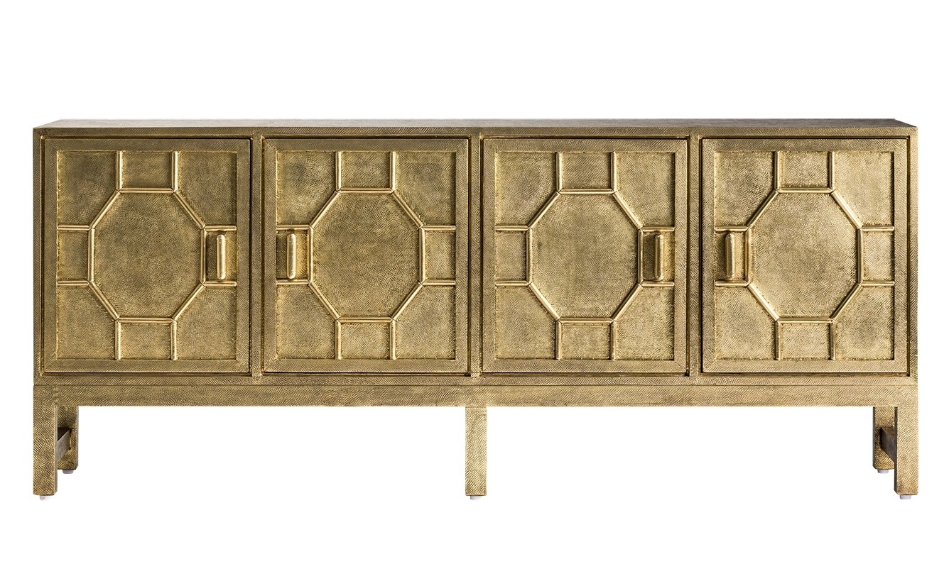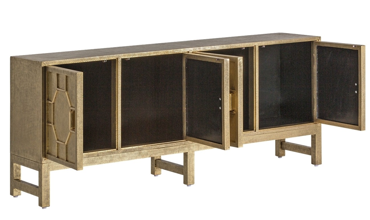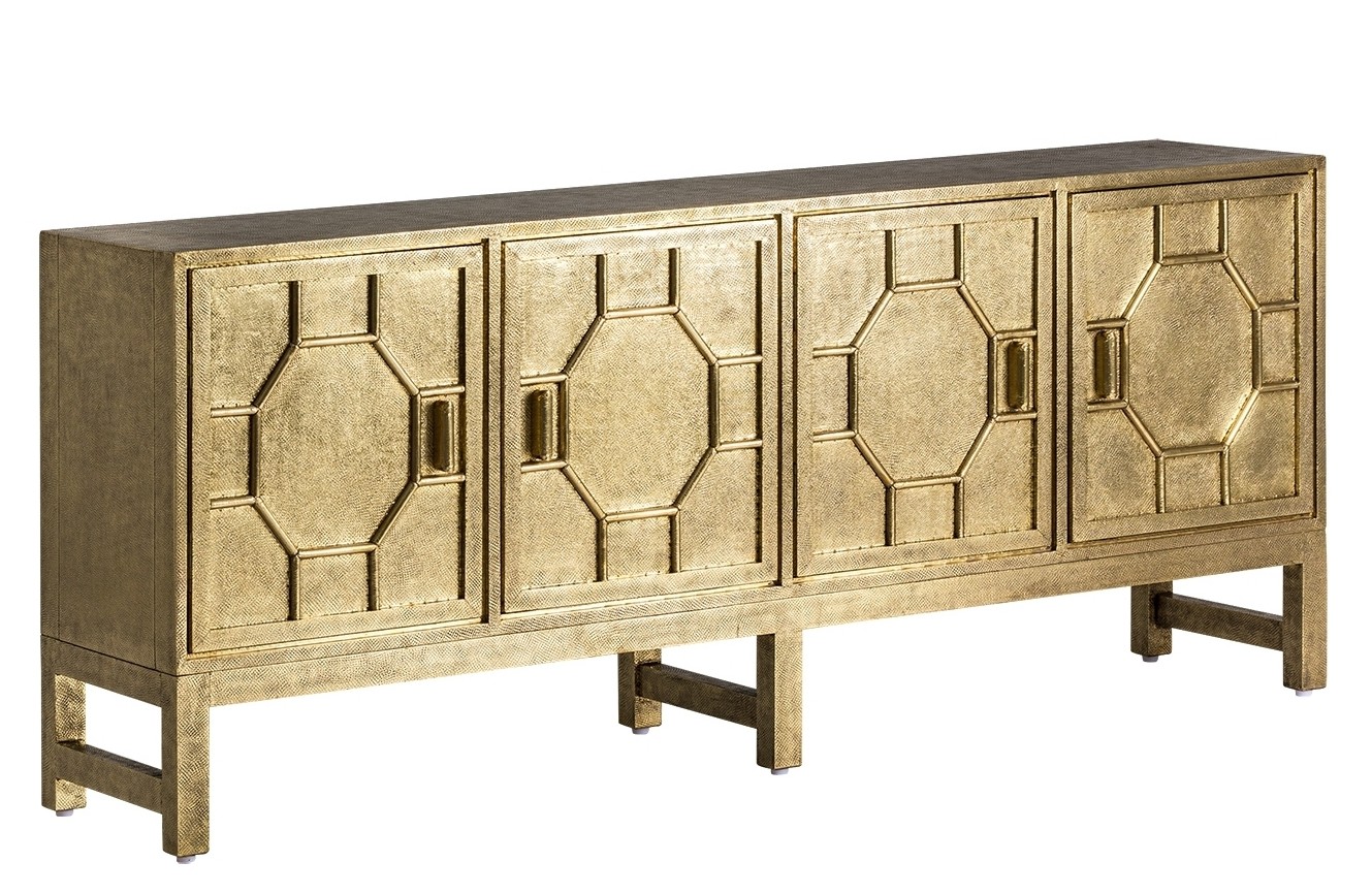 Benson Nickel Entertainment Unit. Individually handcrafted, the Benson luxe four door plinth entertainment unit has been finished in a panelled antique Nickel sheeting with a single adjustable shelf in each side. The elegant storage unit allows for a practical and sleek storage solution. No two items are alike, the beauty of these individually handcrafted products lie in its imperfections. Please consider carefully that these products are suitable for your market.