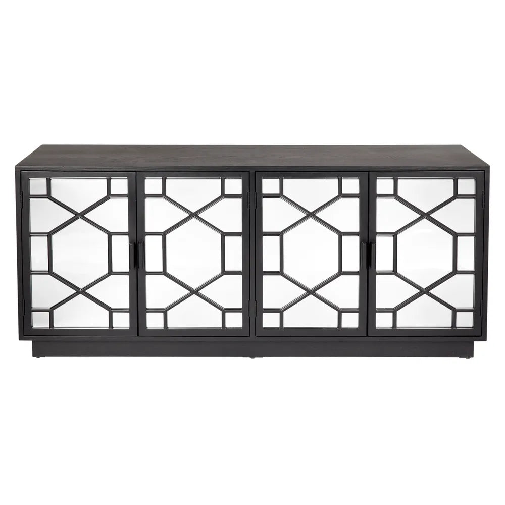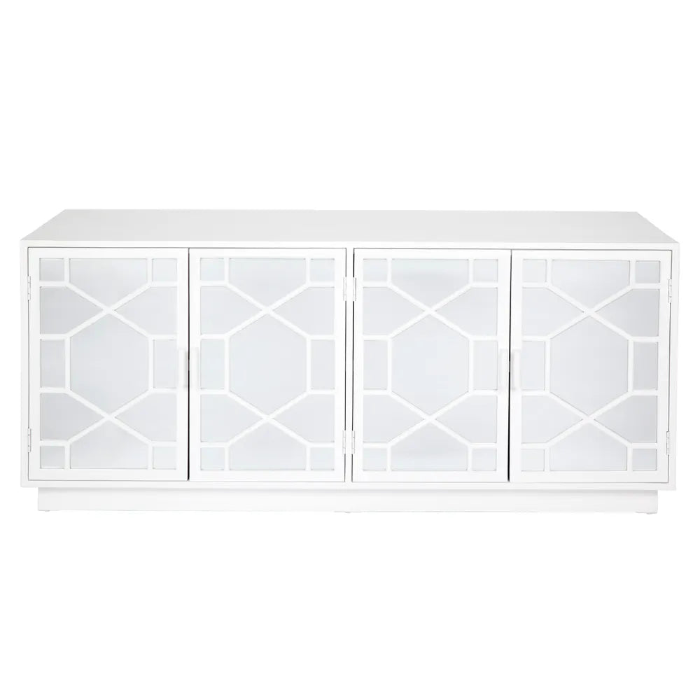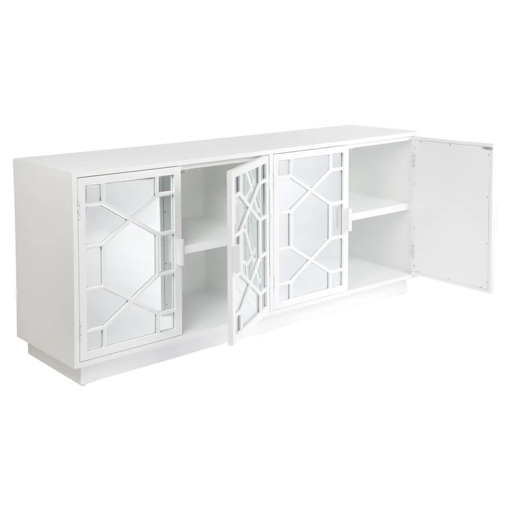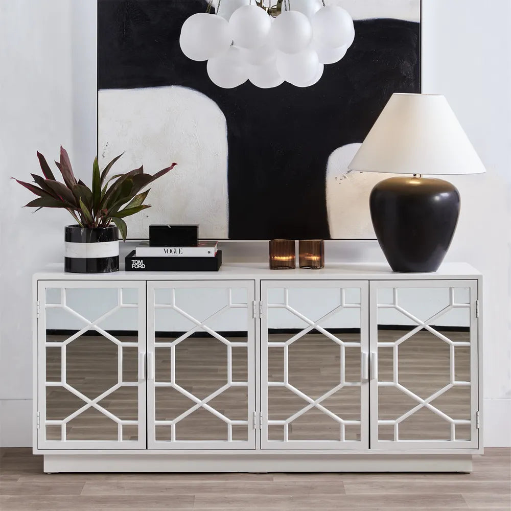 Inspired by the timeless elegance of Hollywood regency, the Benson mirrored buffet features four doors with stunning panelled detailing and mirror inlay. Encased in a chic satin white painted ash wood veneer, the streamlined silhouette delivers on contemporary simplicity while the intricate detailing adds classic character. Opening to a black interior with fixed shelving, the Benson mirrored buffet has been designed with high end homes in mind – to create a beautiful yet functional furniture piece that delivers on modern classic style.