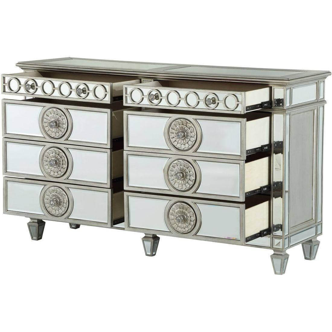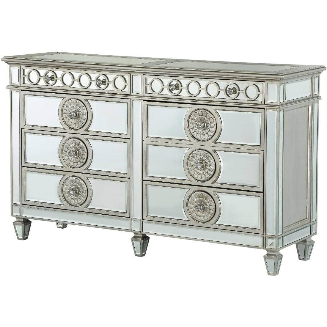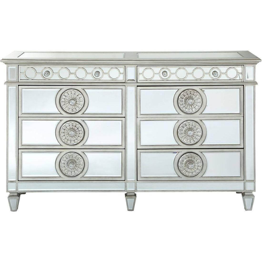 The Borgese large dressing cabinet provides a commanding presence in any room. Crafted with a transitional look that is an ideal addition to any bedroom, this piece is accented with raised geometric patterns and mirror finish.