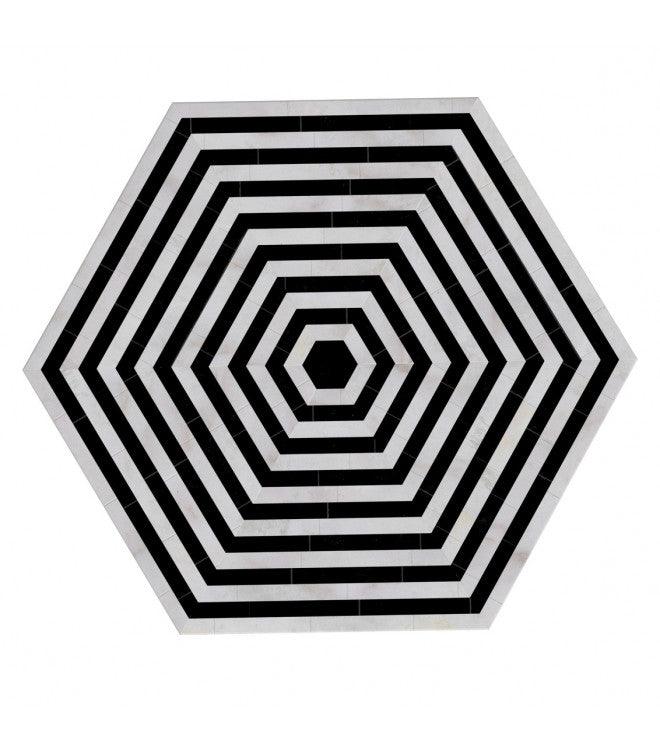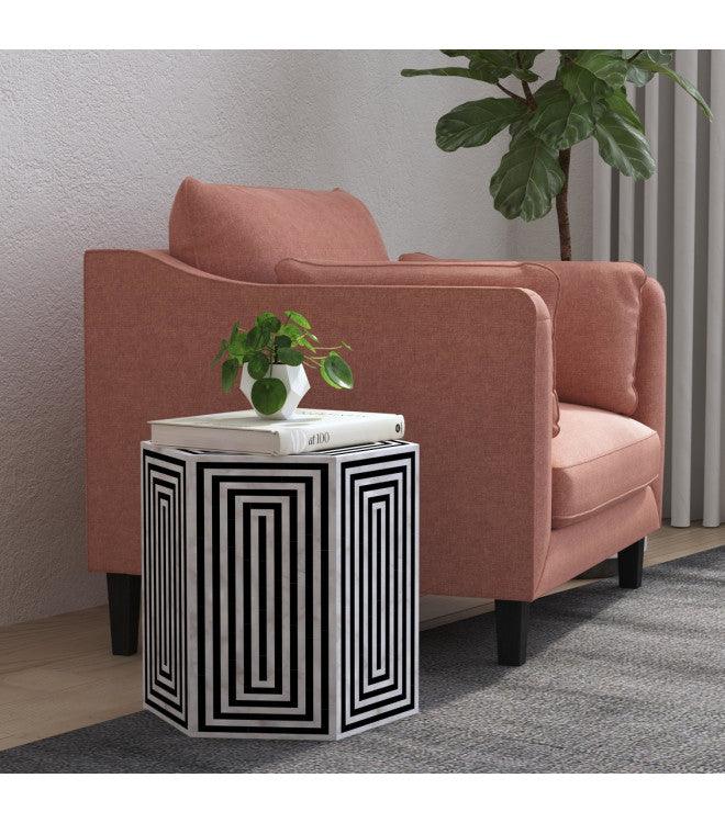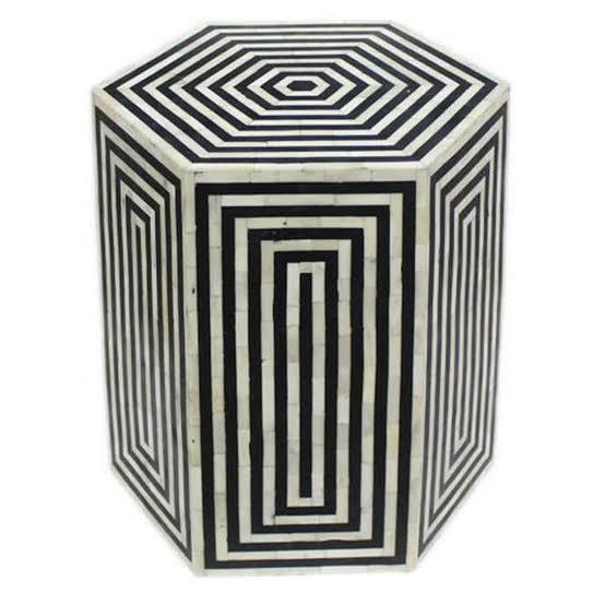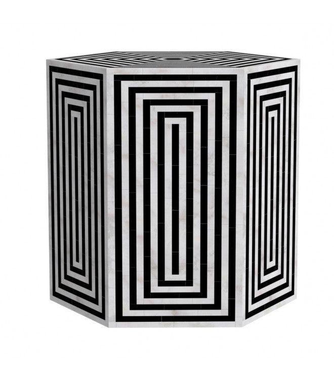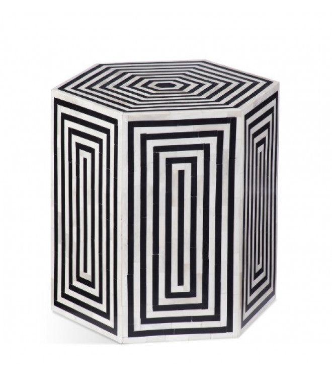 Boston sidetable with Hexagon shape in alternating pattern of black and white bone. Natural bone is a product of nature and is completely unique.. The natural material is subject to variations in characteristics.