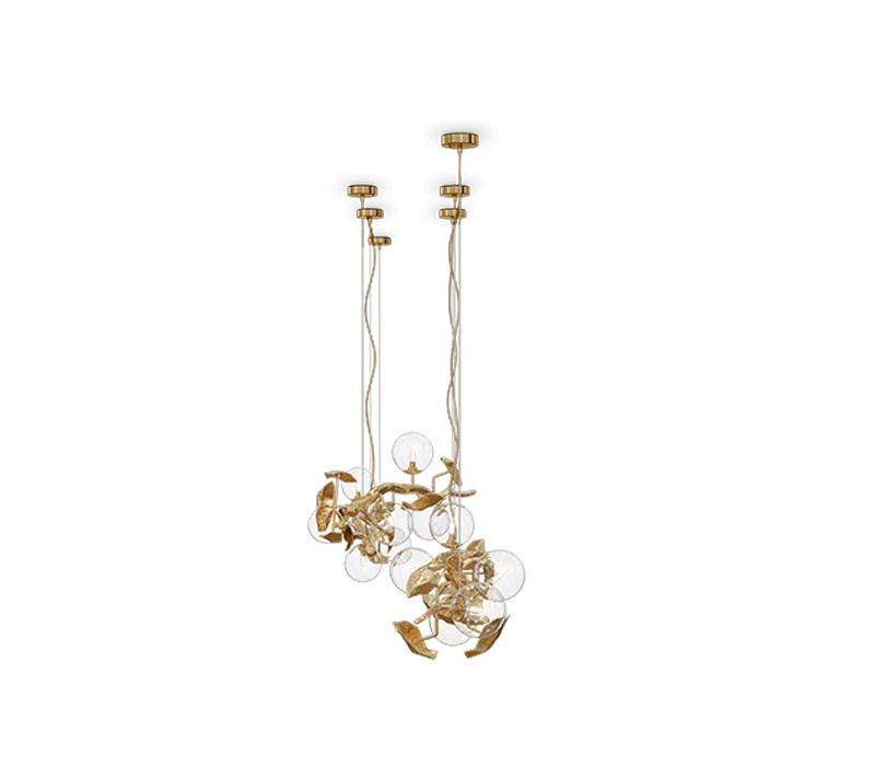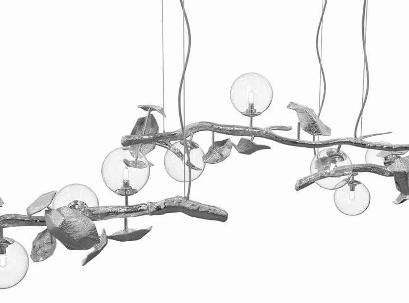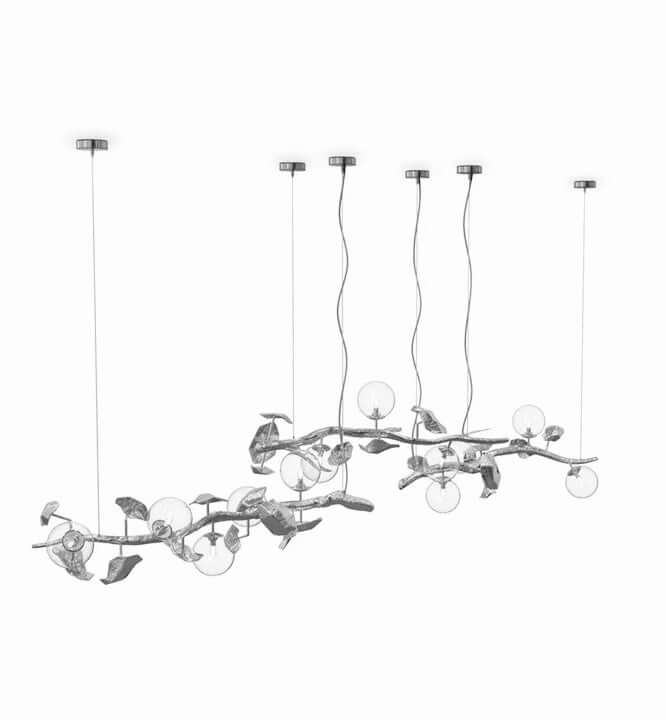 The lighting fixture is moulded to resemble the features and look of a silver branch. Handmade from cast metal in nickel finish, this chandelier has an organic shape and intricate contemporary details to create an adjustable arrangement in a harmonious ensemble. Suitable for sophisticated living and dining rooms. A modern lighting fixture with a triptych structure made of cast metal, with an adjustable arrangement. Round bulbs in clear glass.