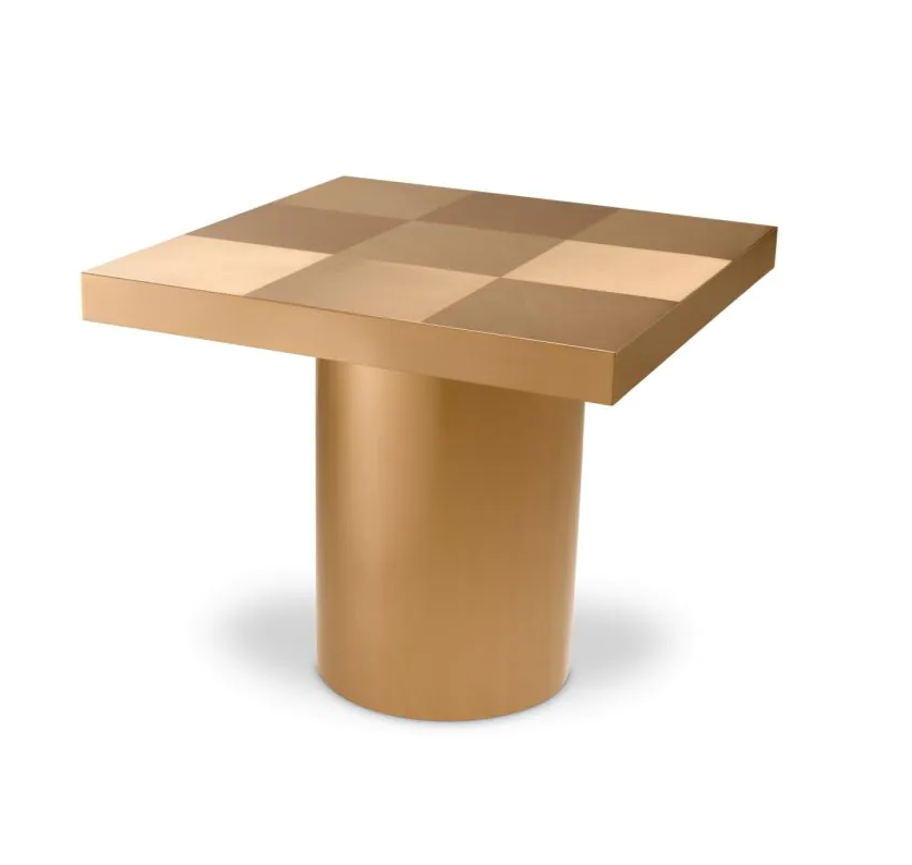 A stunning piece of artistry with a brushed brass finish. Its unique design features squares created by brushing in different directions, adding a touch of intrigue and contemporary flair. Embrace the captivating allure of this collection Side as it becomes a focal point in your living space, showcasing its modern charm and artistic craftsmanship.