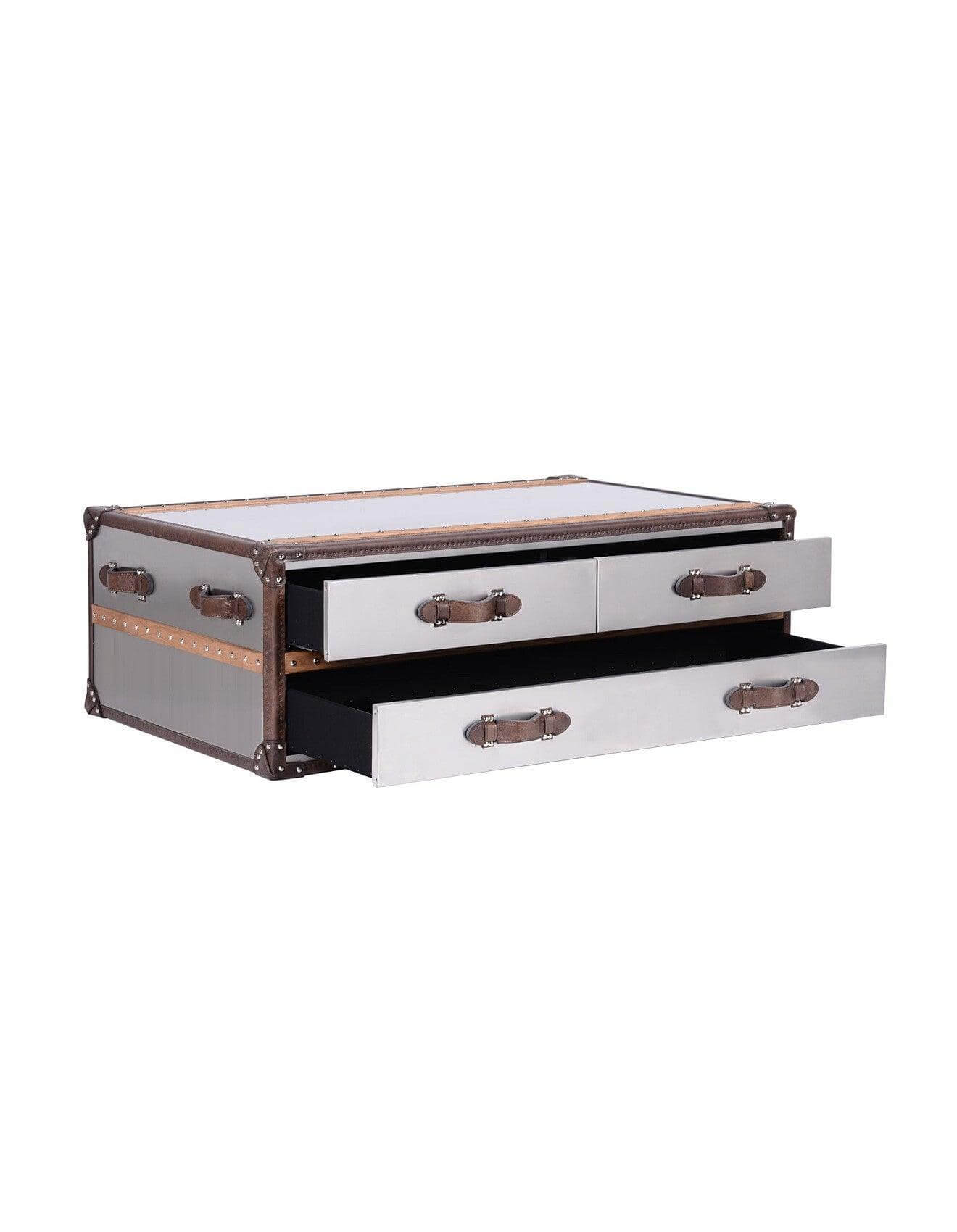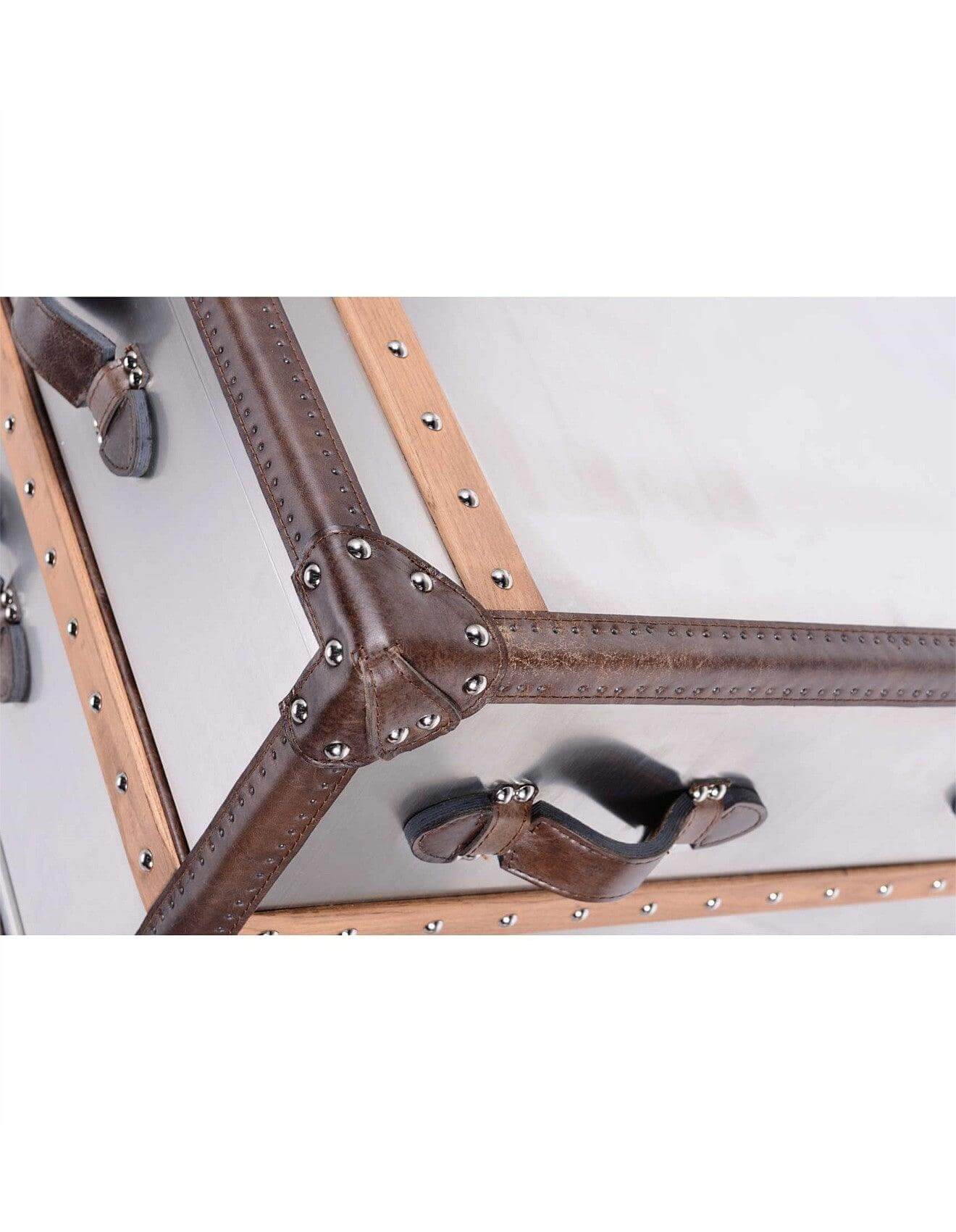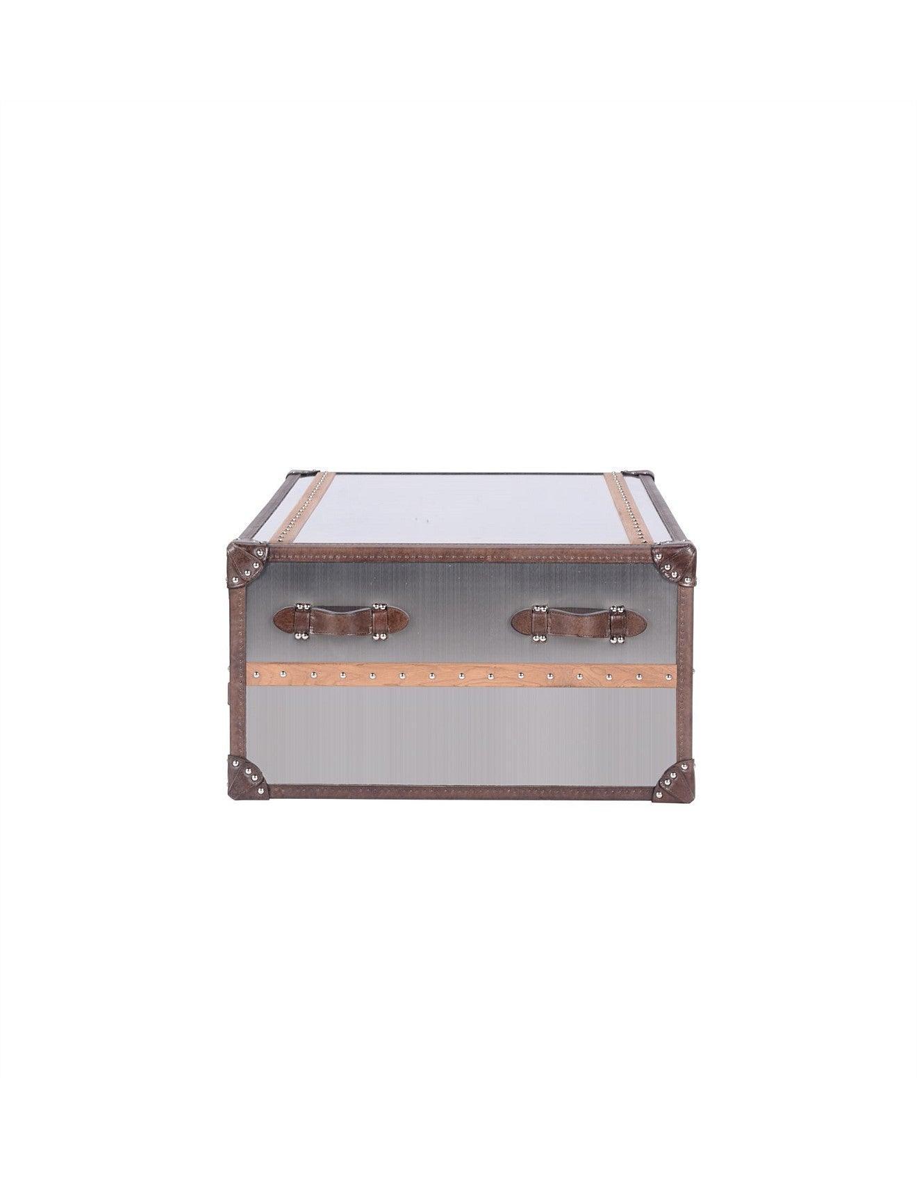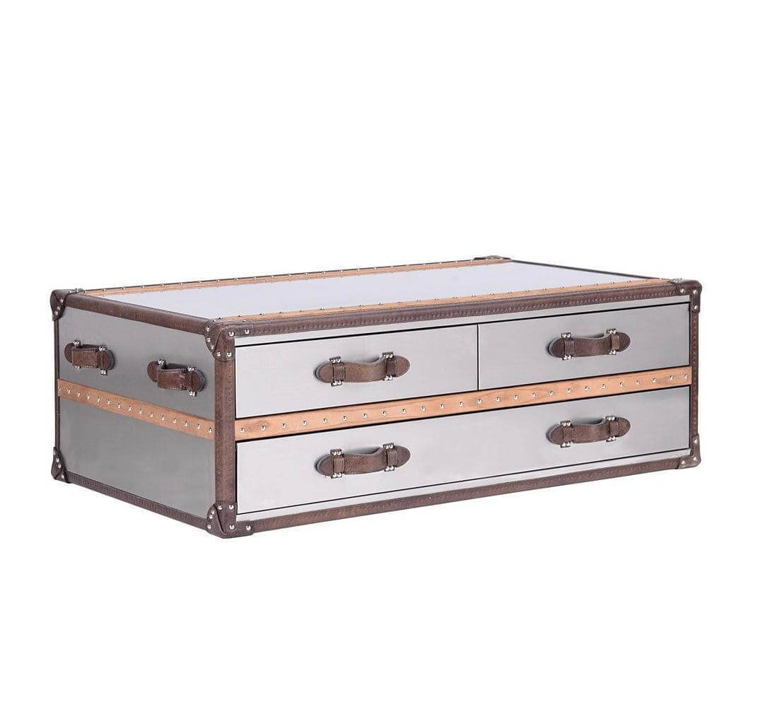 Brenton Brushed Silver Oak Coffee Table Trunk. Solid oak handcrafted wood and brushed silver metal exterior. Coffee table has 3 x drawer and genuine brown leather details. Hand finished techniques are used on this product and the craftsmanship and detail recreated in many of the pieces is a tribute to the antiques trade of the United Kingdom.