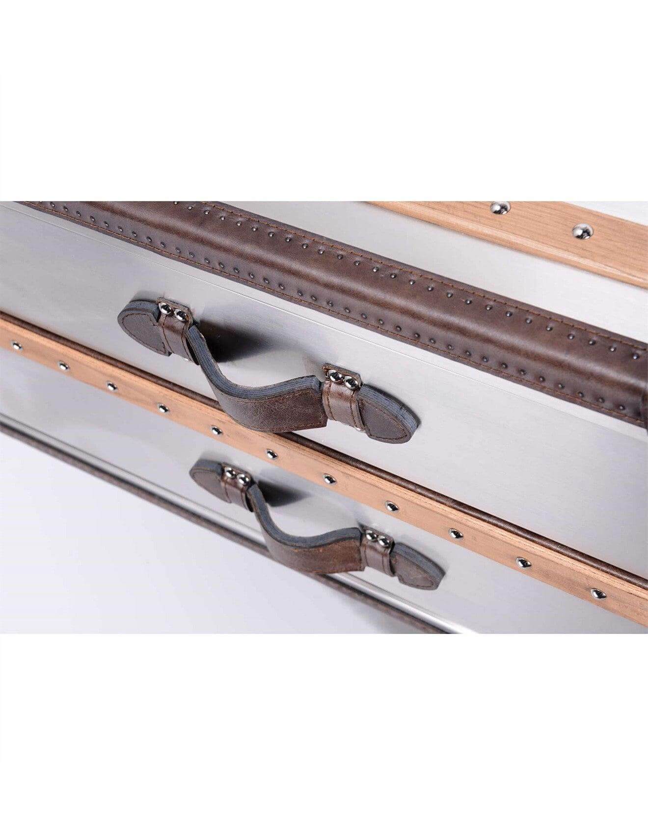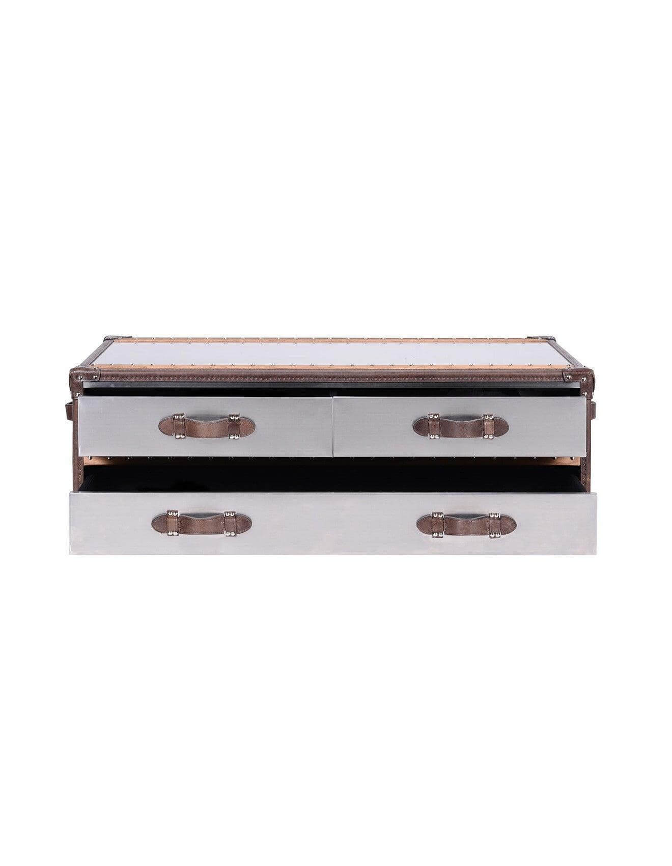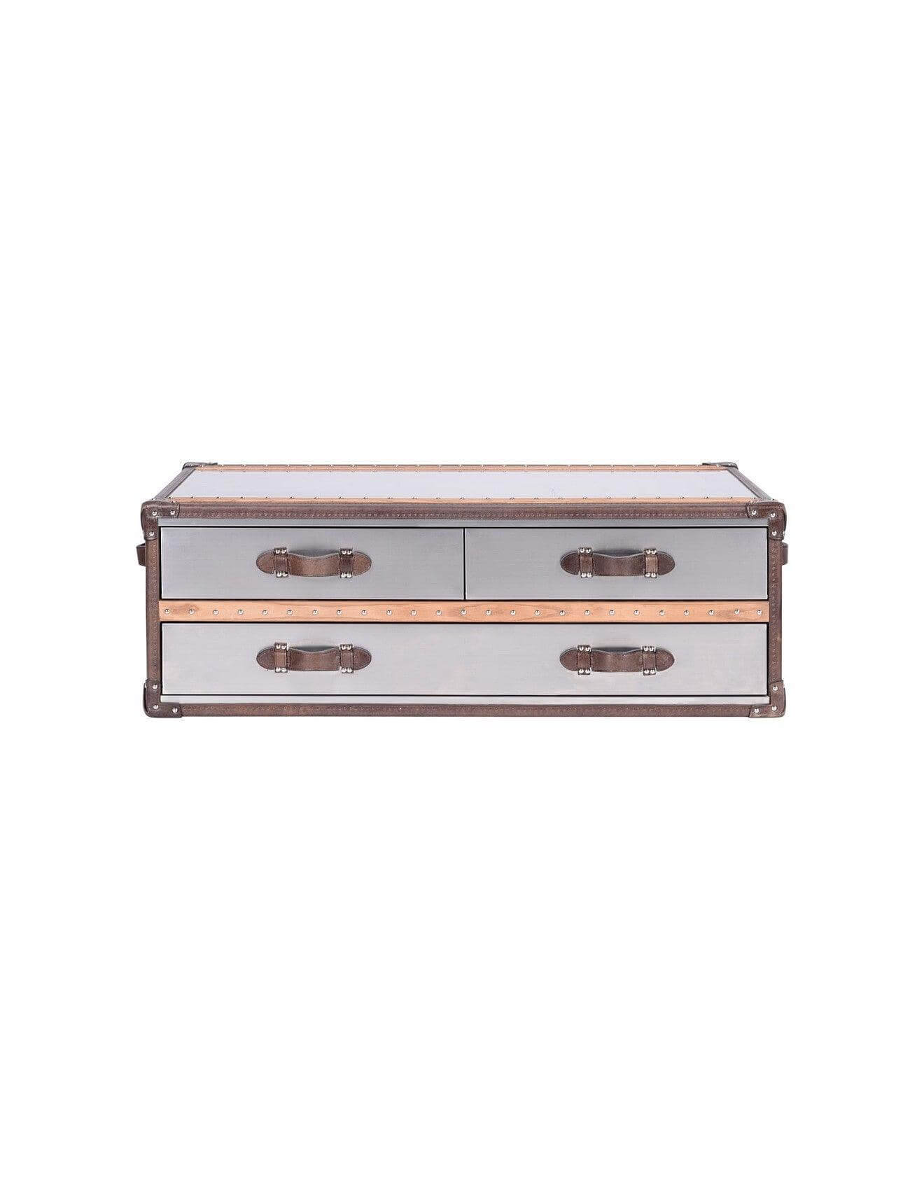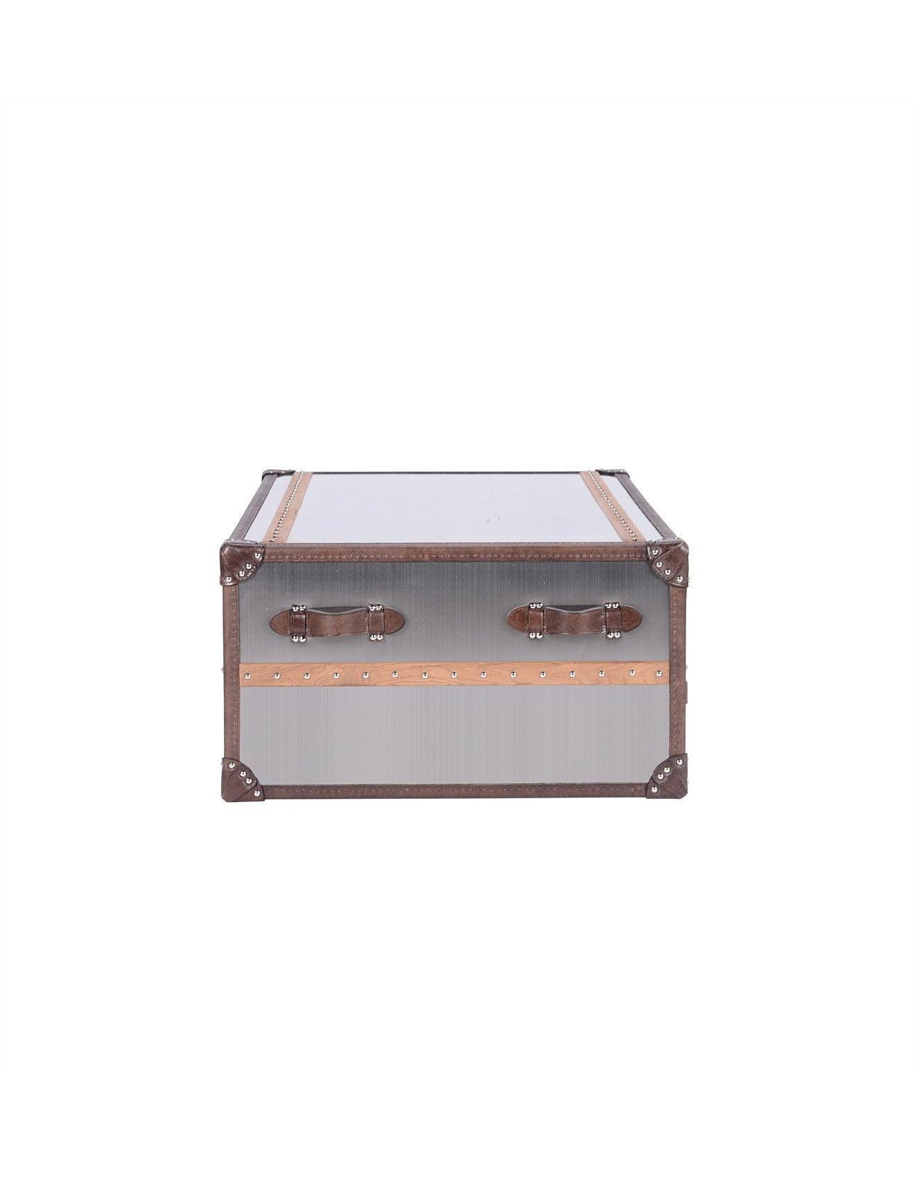 Brenton Brushed Silver Oak Coffee Table Trunk. Solid oak handcrafted wood and brushed silver metal exterior. Coffee table has 3 x drawer and genuine brown leather details. Hand finished techniques are used on this product and the craftsmanship and detail recreated in many of the pieces is a tribute to the antiques trade of the United Kingdom.