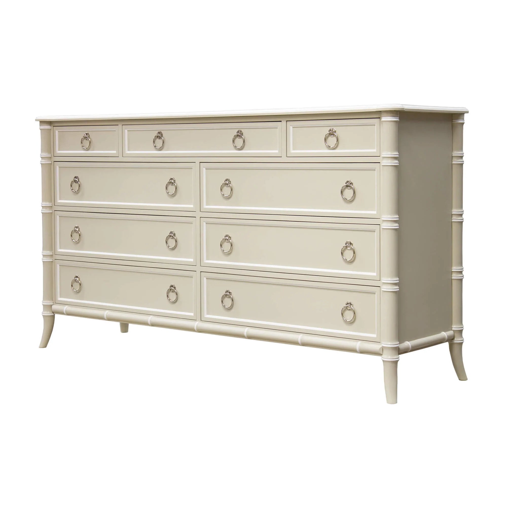 In the Regency Brighton Pavilion manner, this chest was designed by Dorothy Draper and wonderfully matches traditional with modern day tastes. The double bureau captures Dorothy Draper’s love of Chinese Chippendale. The bureau is constructed of solid hardwood with solid brass hardware.
