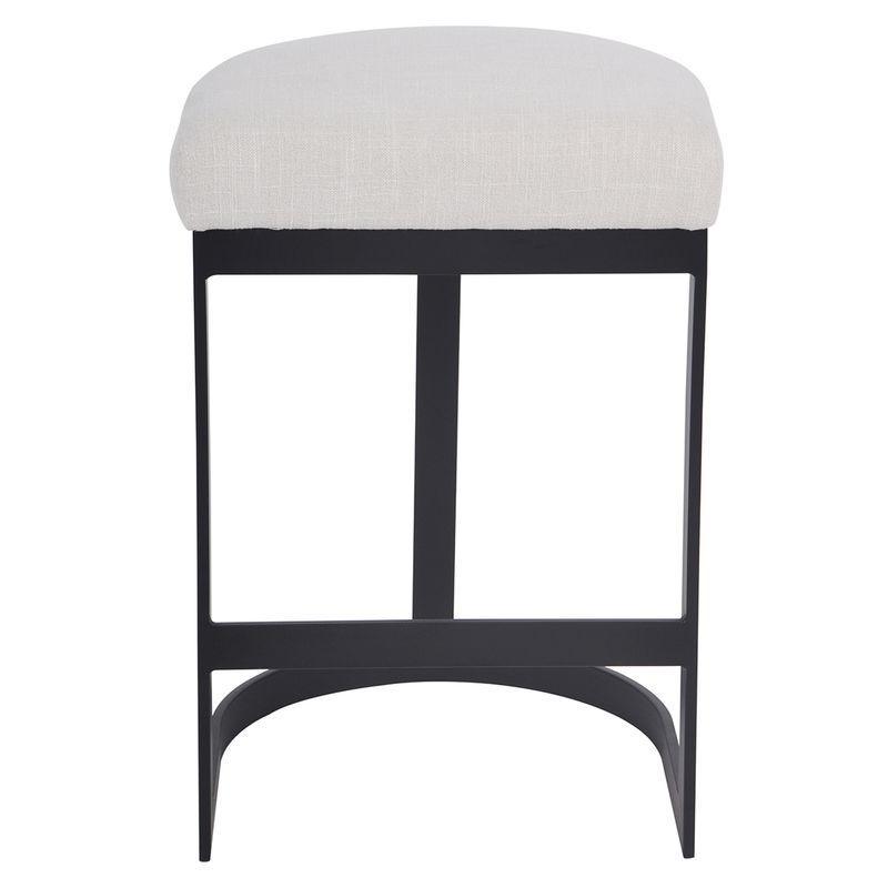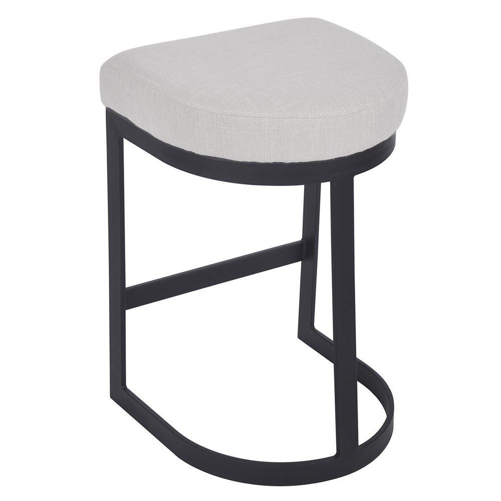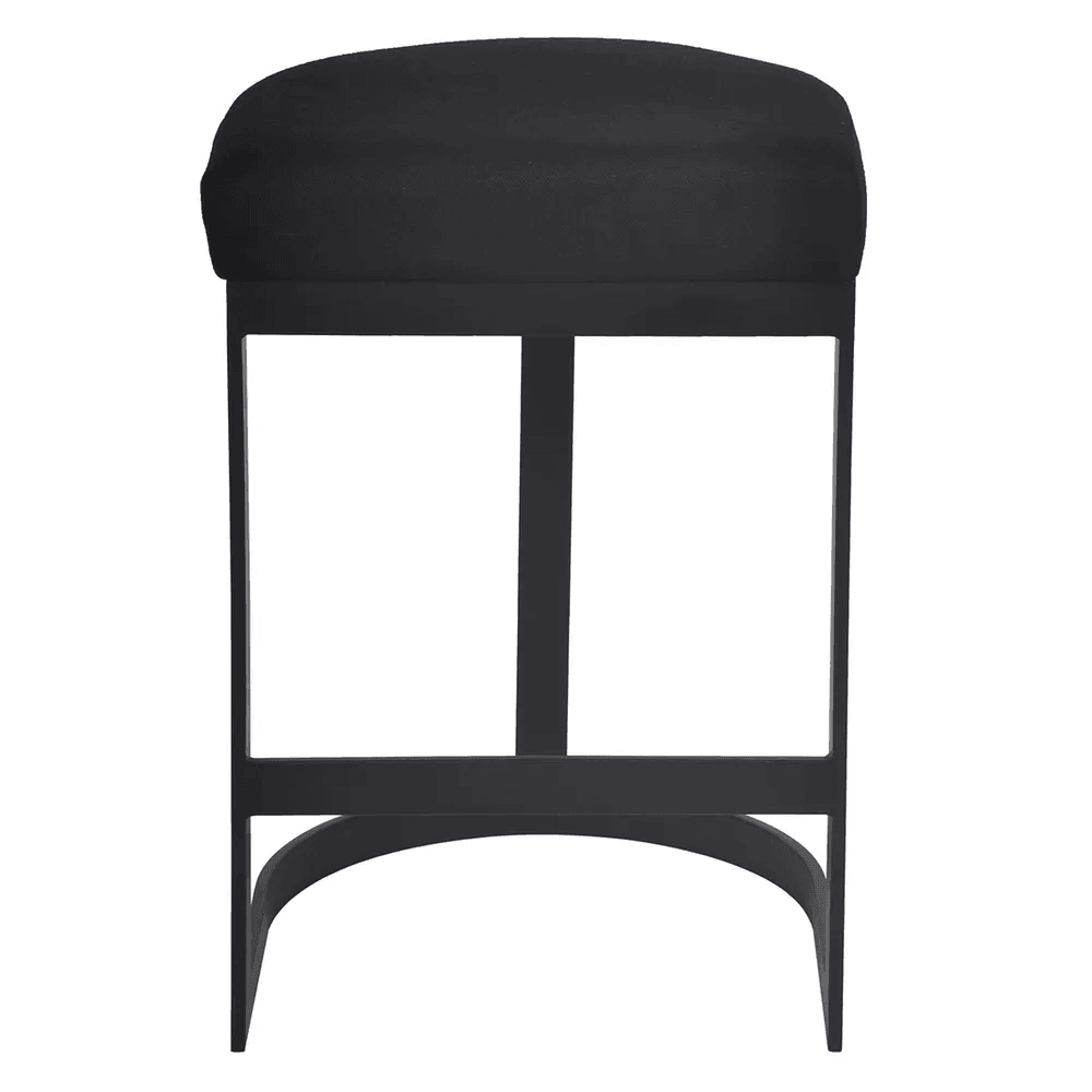 Black linen upholstered kitchen stool with black coloured steel frame legs.
