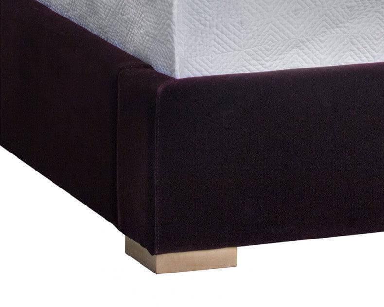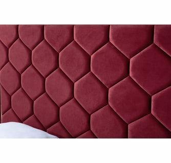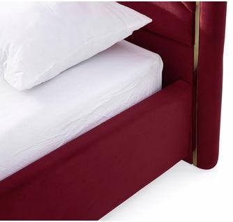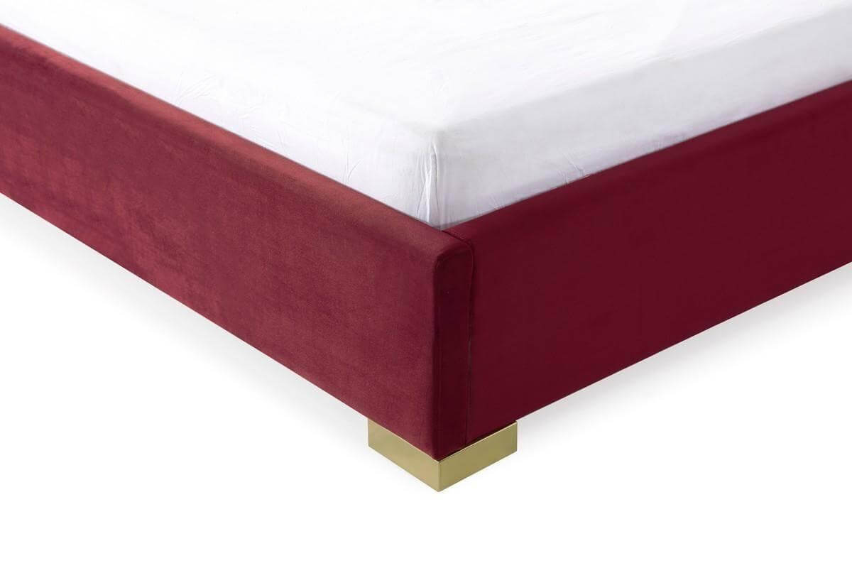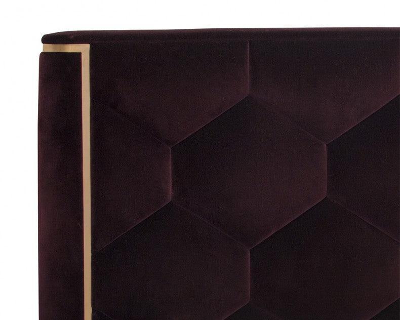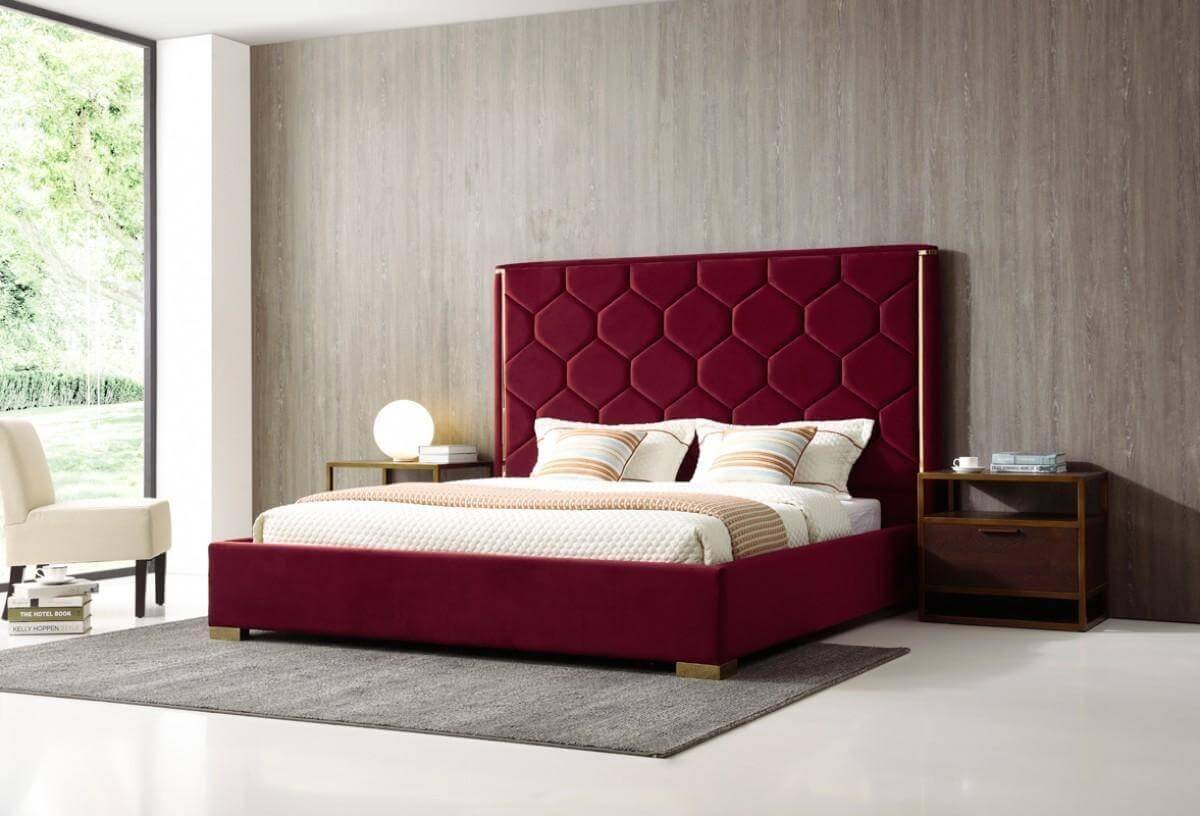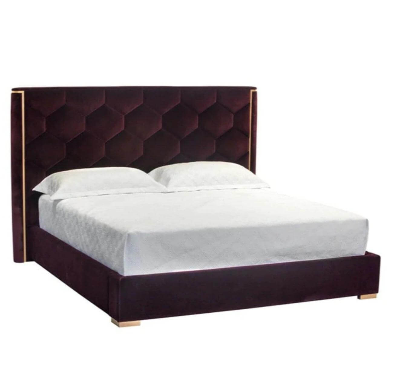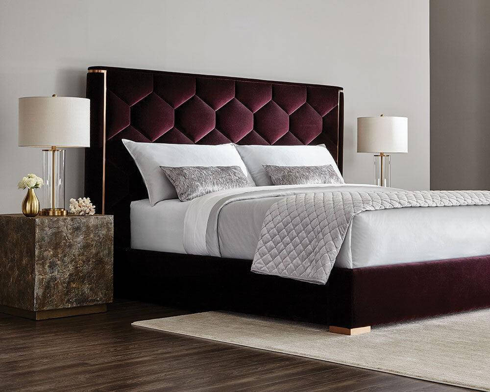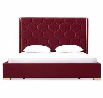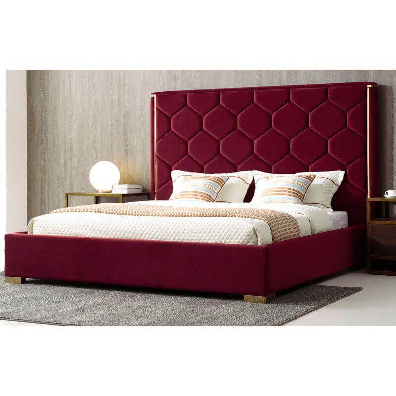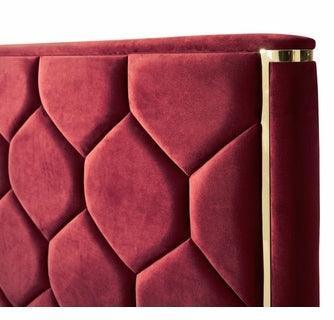 Brookhaven Rouge Velvet Gold King Bed. With this rouge velvet and gold bed, opulence meets modern design. Transform the look of your bedroom by changing out your current bed with this new beauty. Upholstered in stunning red velvet with golden accents, this bed comes in queen or eastern king sizes. Fill your bedroom with this stunning shade of brass for a more stylish look and restful sleep. The high headboard features a unique modern geometric tufting pattern, which will draw the eye to this stunning piece. Add quality and style to your bedroom decor with this bed that steals the spotlight in your room.