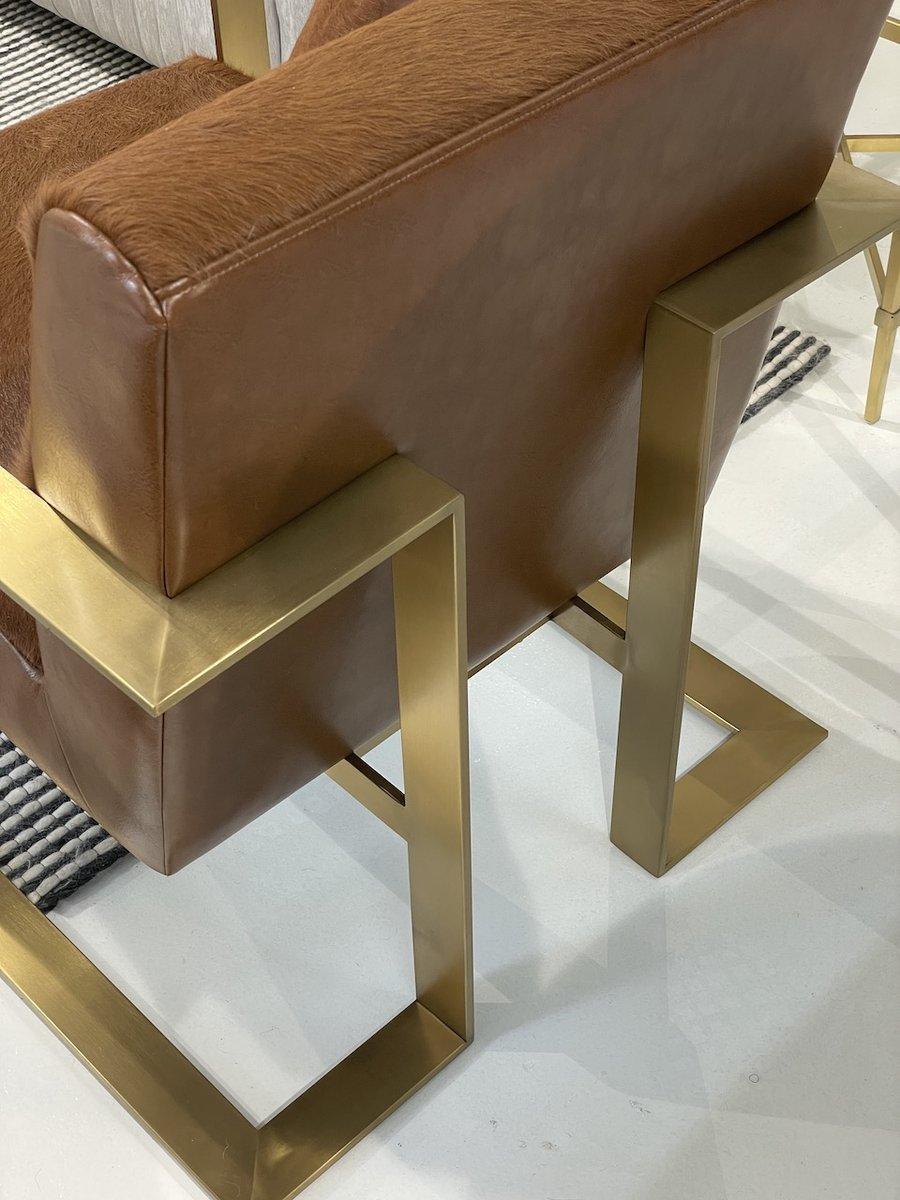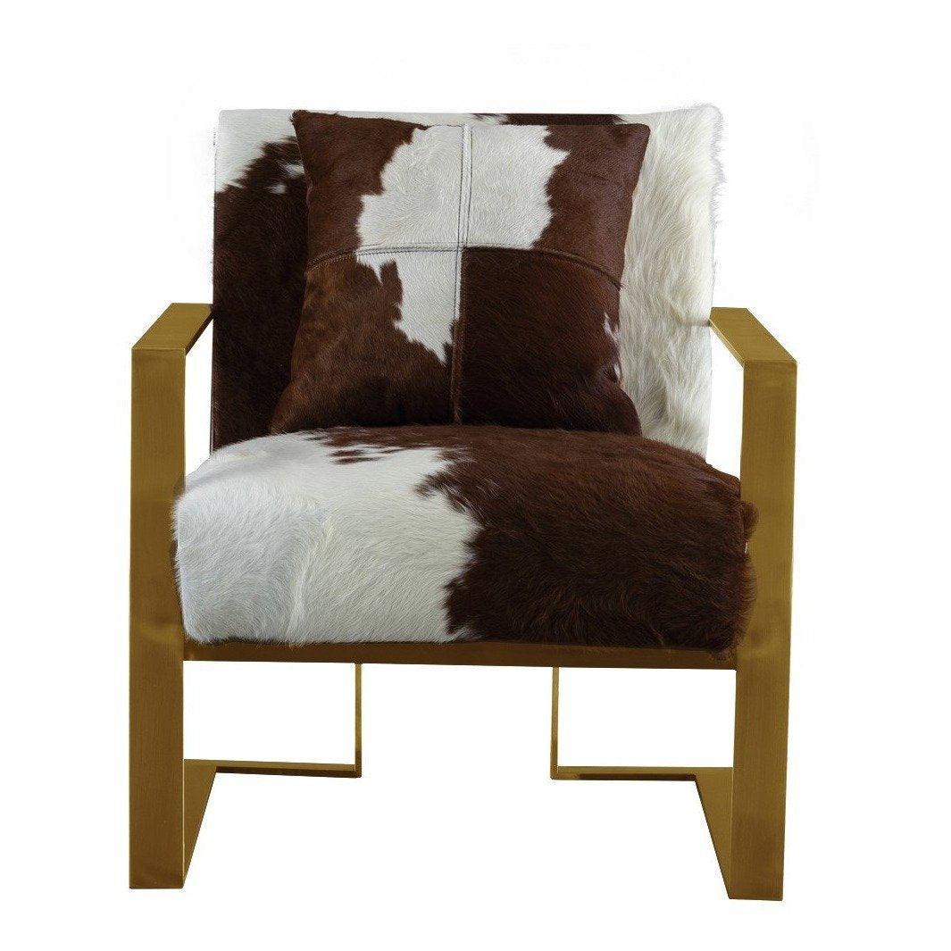 A genuine cowhide leather chair thats unique and different and sure to make a statement in any room. Features Brushed Gold on a stainless steel frame with real genuine Cowhide. This is a natural hide of leather so no two are alike, hides differ as this is not a man made product. This chair compliments many of our exclusive sofas and can be easily matched together because of it’s natural leather appearance.