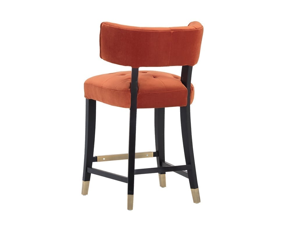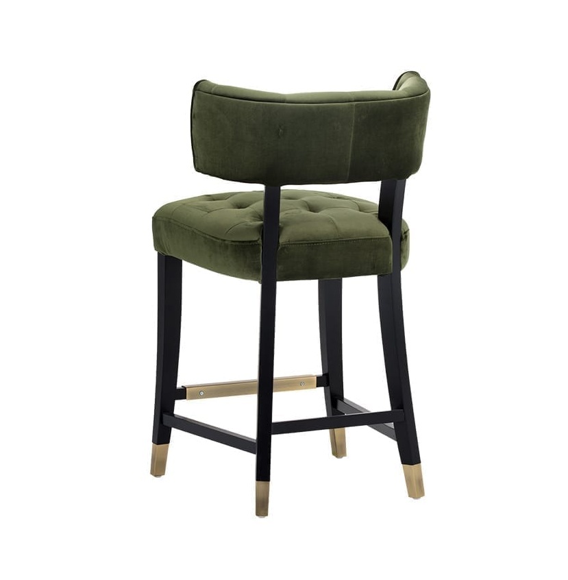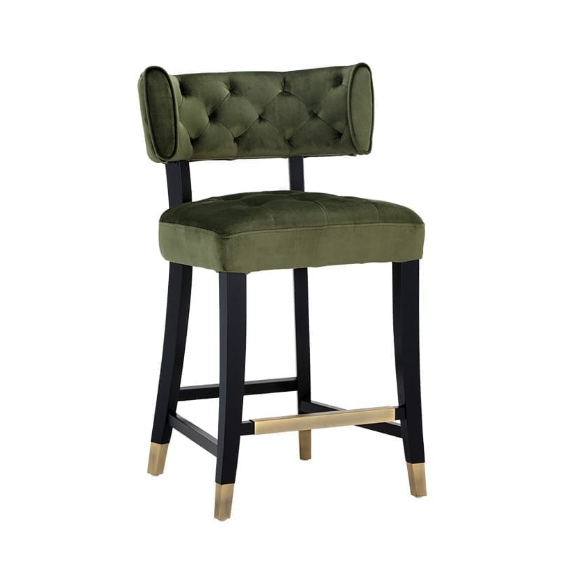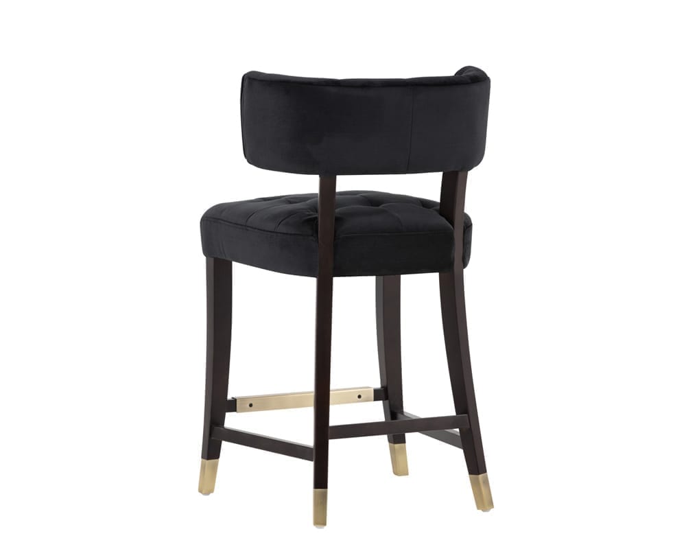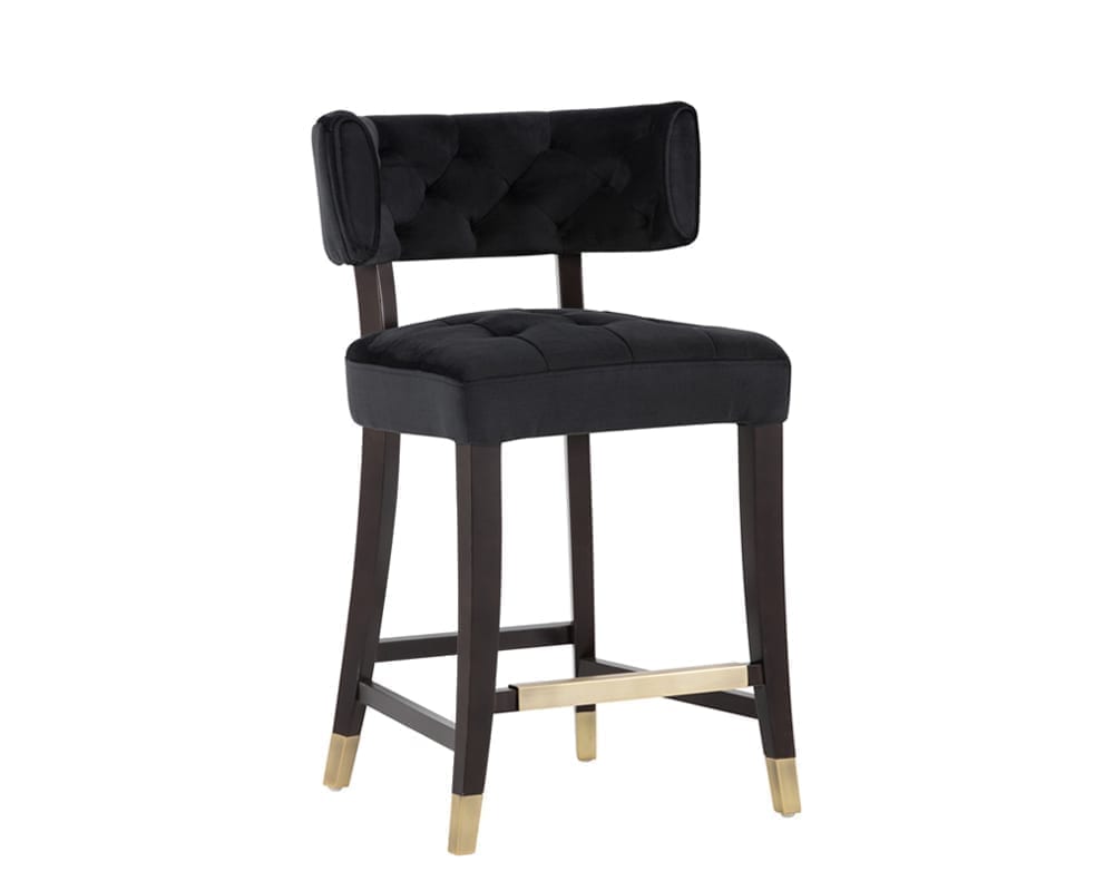 This stylish designed counter stool from our Cambon collection features tufting on a curved seatback and cushioned seat, for comfort and transitional flair. Stocked in a soft and luxurious velvet fabric. An exposed solid black wood frame with brushed gold caps and a matching footrest complete the look. Stretchers added for extra durability. Suitable for various dining, kitchen and bar spaces of all sizes.