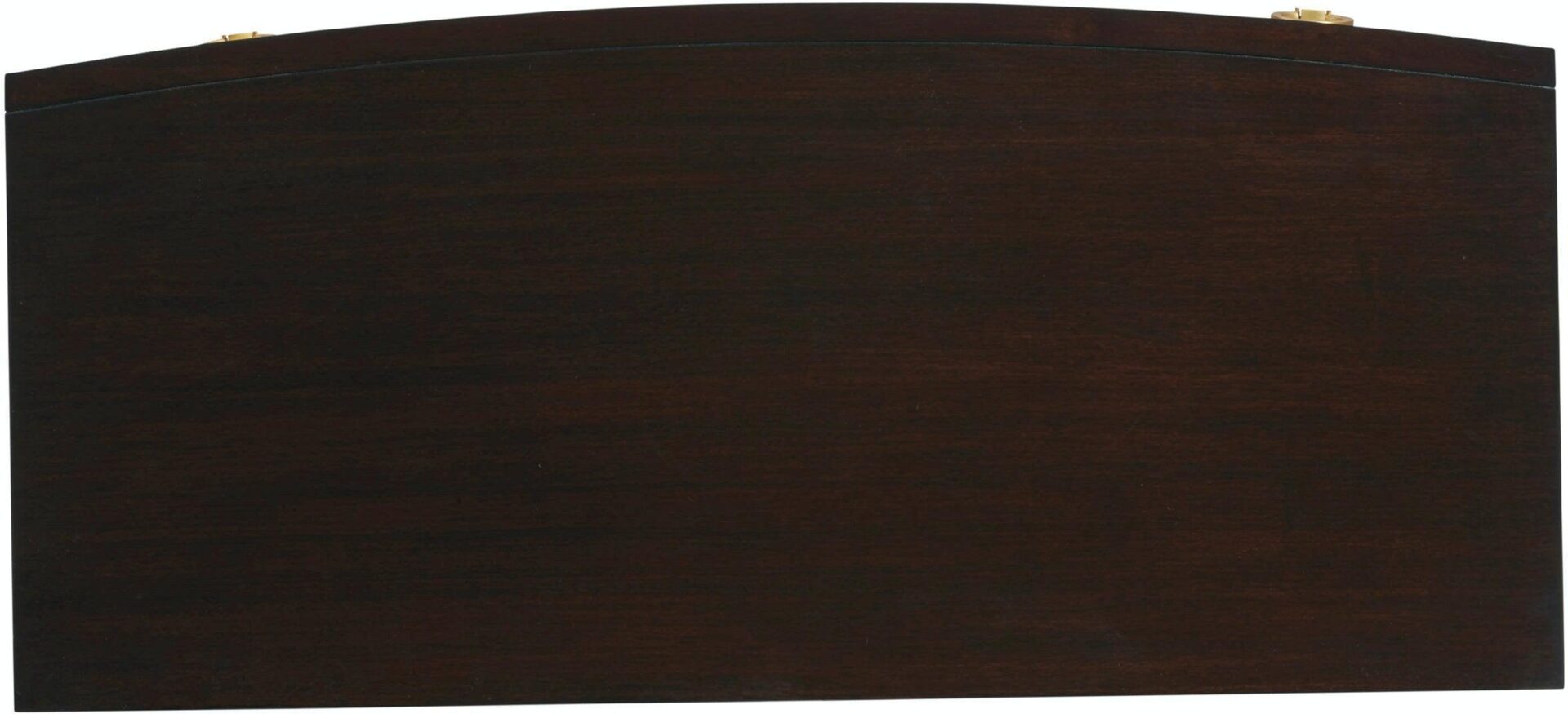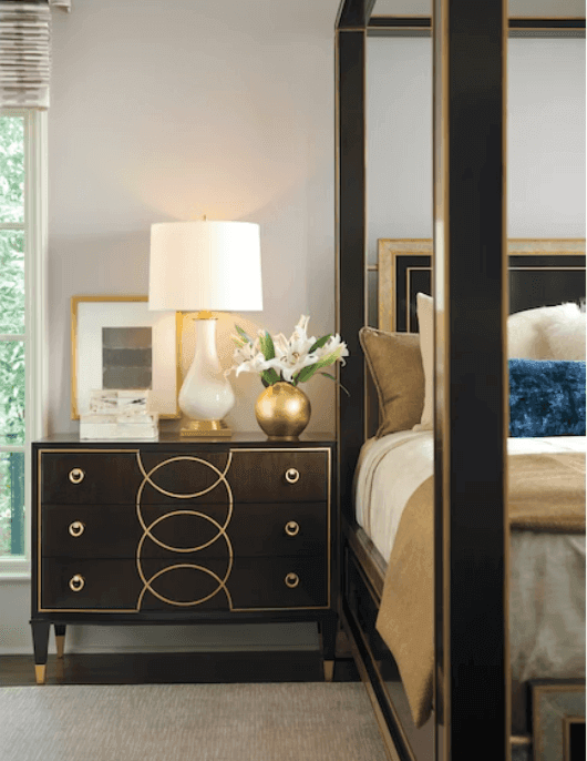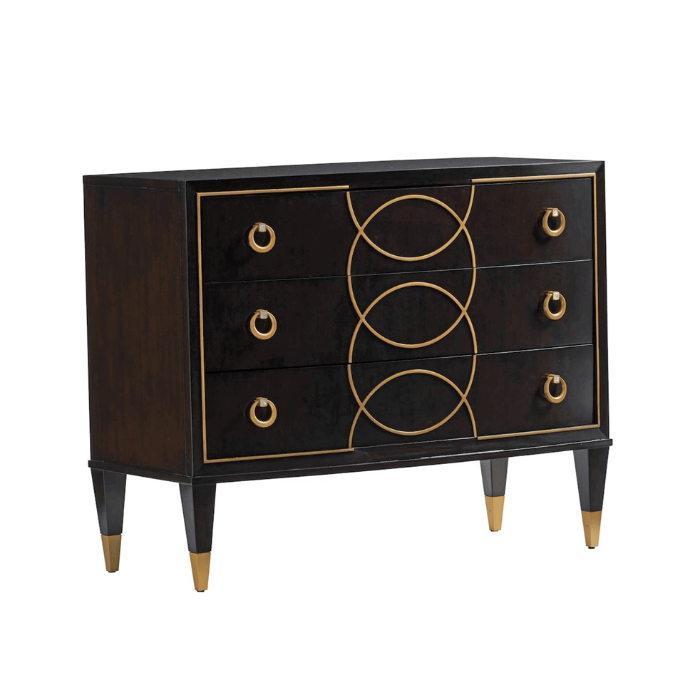 Bowfront, gold striping, gold painted interlocking circle motif on the 3 drawers, tapered feet with brushed brass finished metal ferrules. Crafted from flat cut and quartered walnut veneers and select hardwoods in a rich walnut finish. Select items feature gold painted accents, faux shagreen and painted interiors. Satin gold finished ferrules and custom hardware in a satin gold finish with mother of pearl inlays.