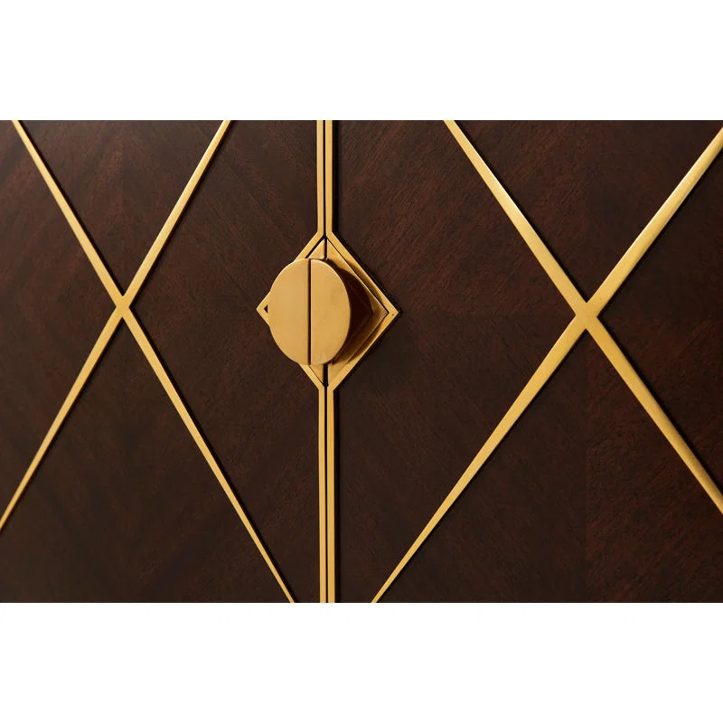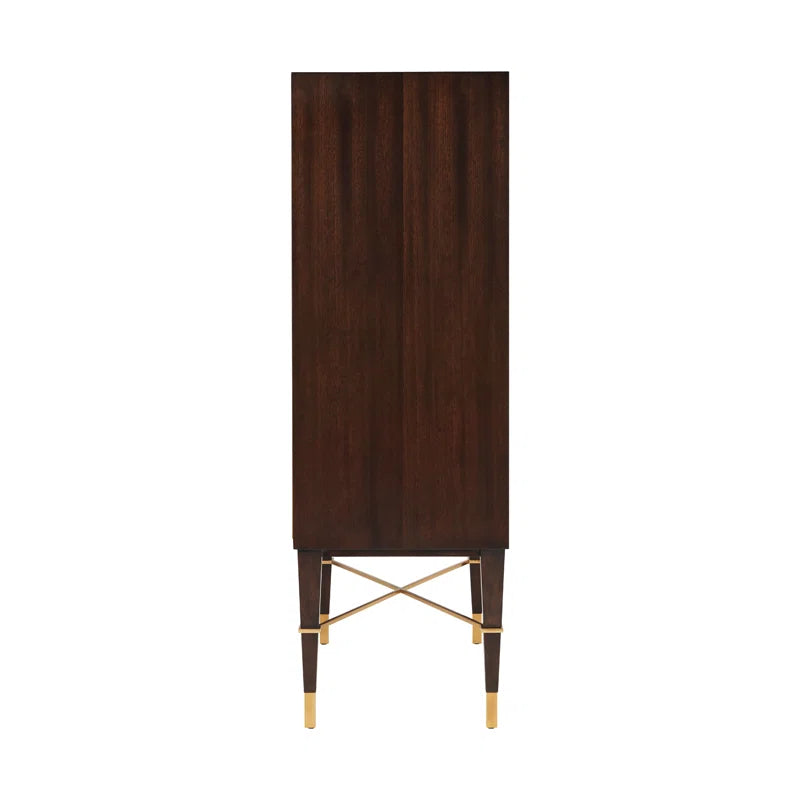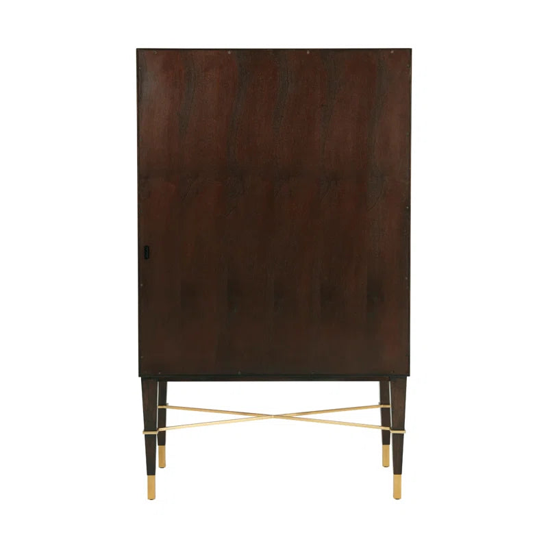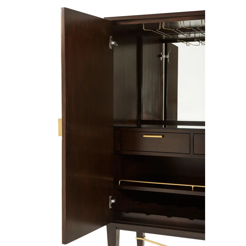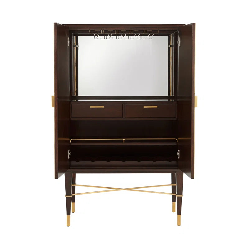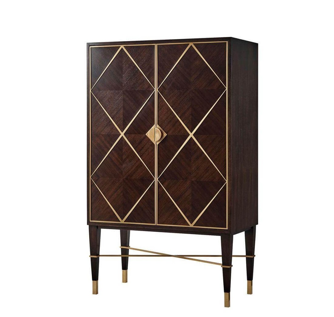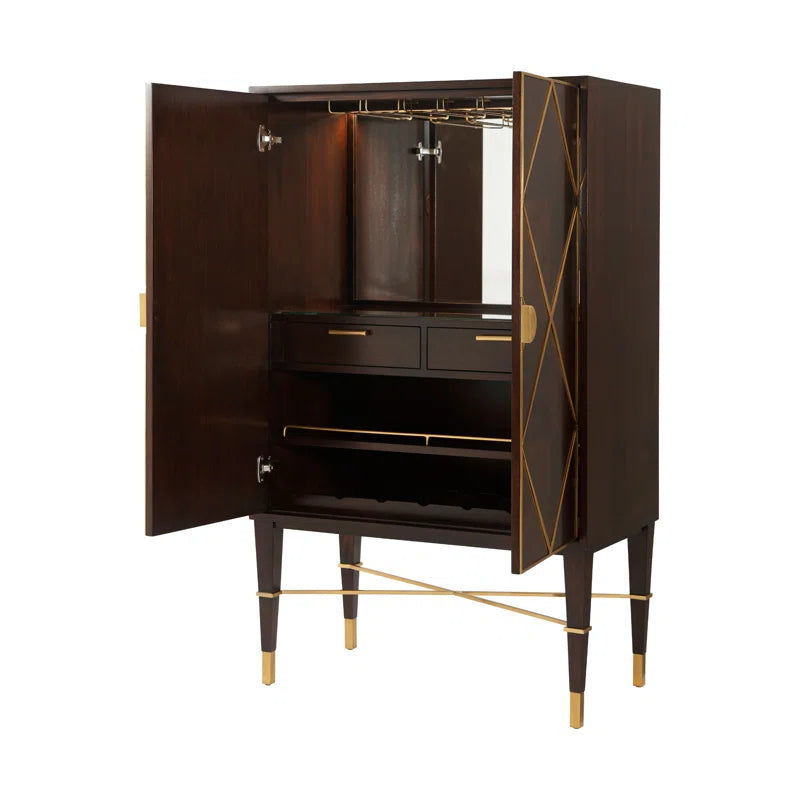 An intoxicating bar cabinet! Mahogany parquet door fronts are overlaid with geometric brass diamond trim and Y handles. Set on square tapered legs with a brass X stretcher. Inside, Max fulfills his liquor cabinet mission: LED-lit with mirror back, glass hangers, galleried shelf, wine rack, and two drawers. This mahogany bar cabinet adds interest with brass details. Open it up, and you’ll see a beautiful mirrored back with all the storage you could possibly need for stemware, bottles, bar tools, and more.