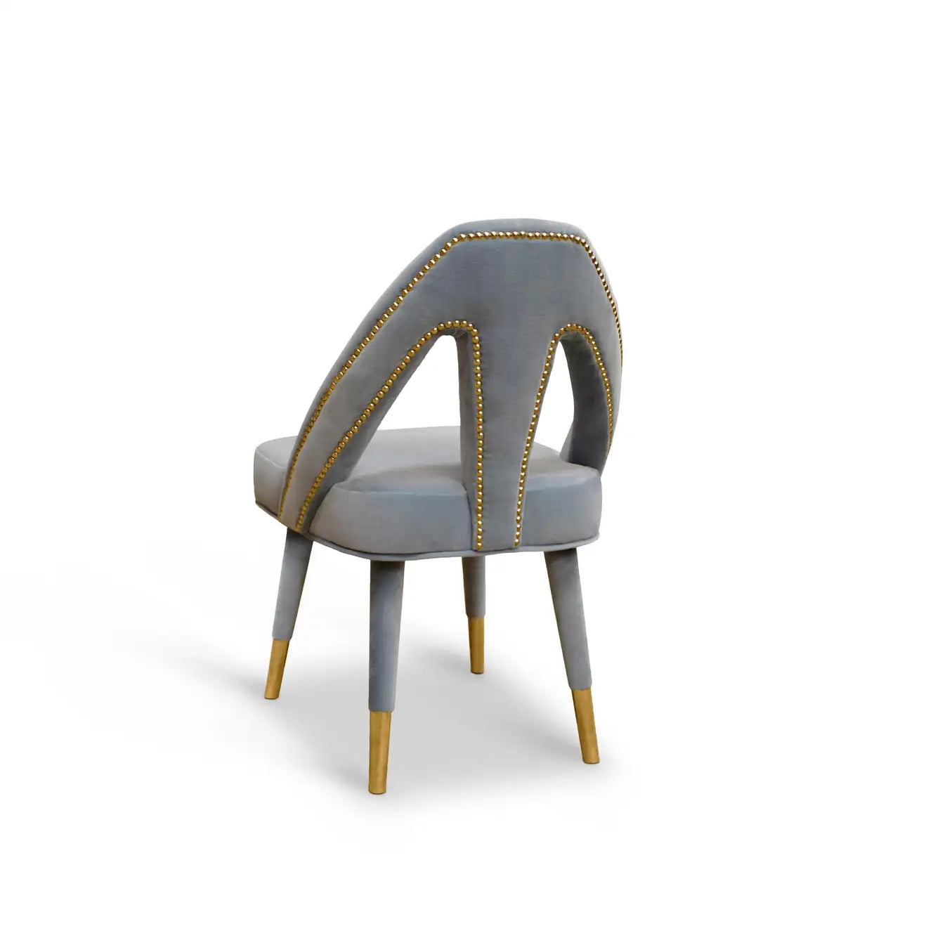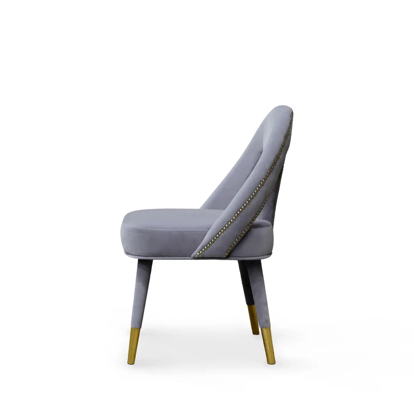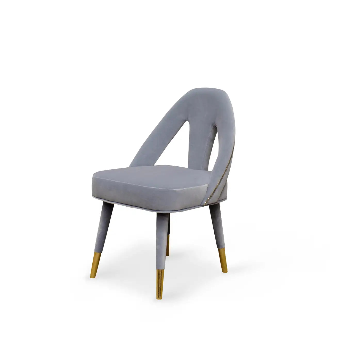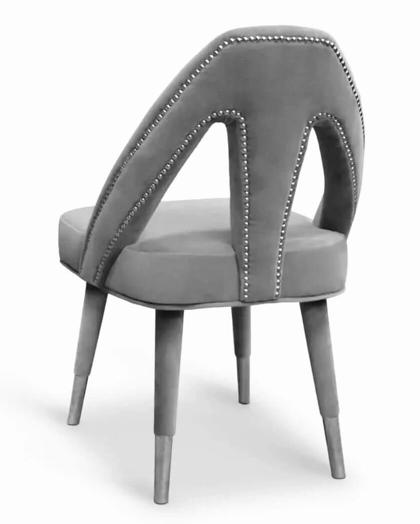 Inspired by Paris, the charming capital of lovers, the Caron Mid-Century Modern dining chair exhibits a fascinating and romantic design. Any contemporary living space will become a passion nest where seduction and love live an intense affair. This elegant piece is upholstered in sensual grey velvet, held by beechwood legs draped in velvet and polished chrome nails on the back. Its bewitching and soft lines are ideal for any modern décor