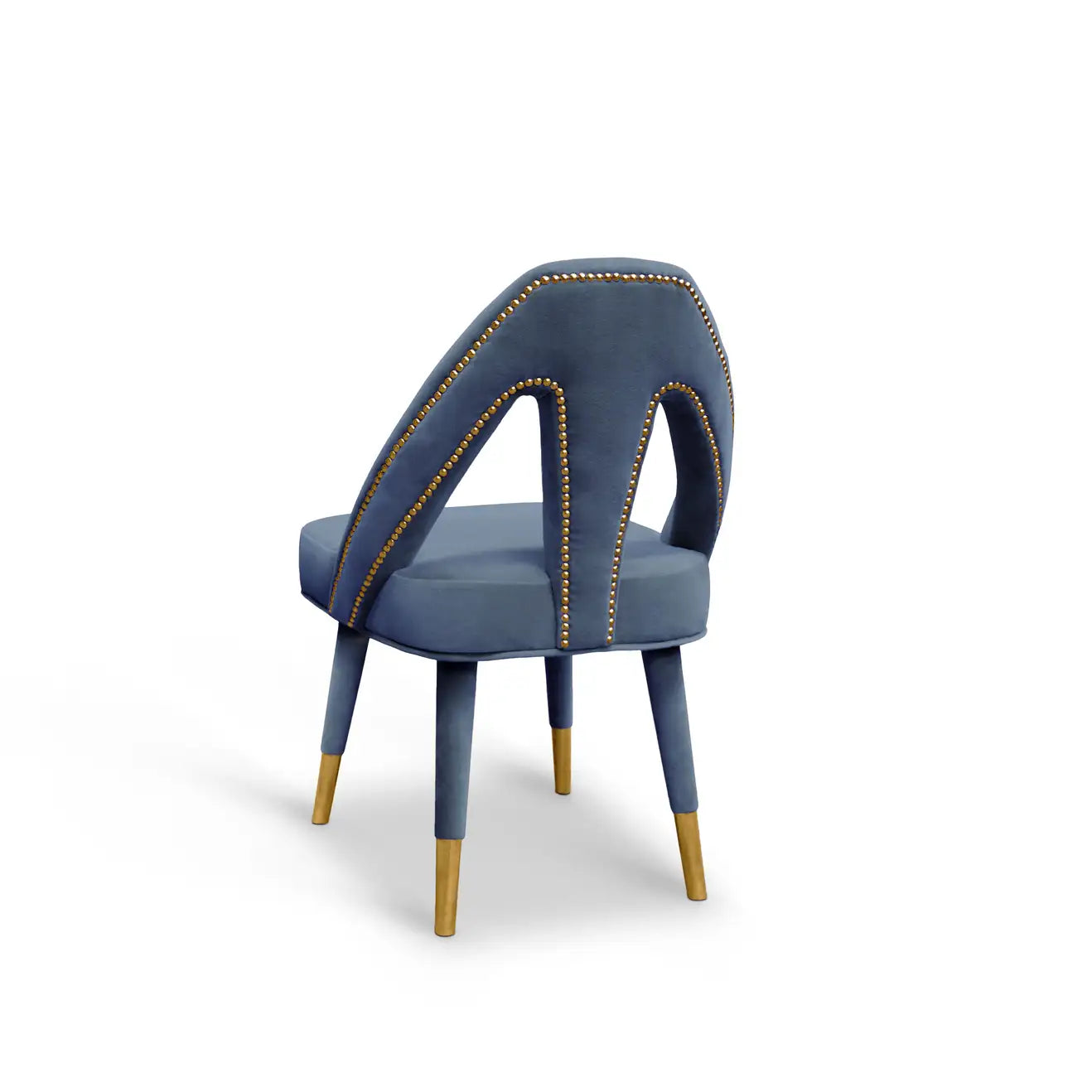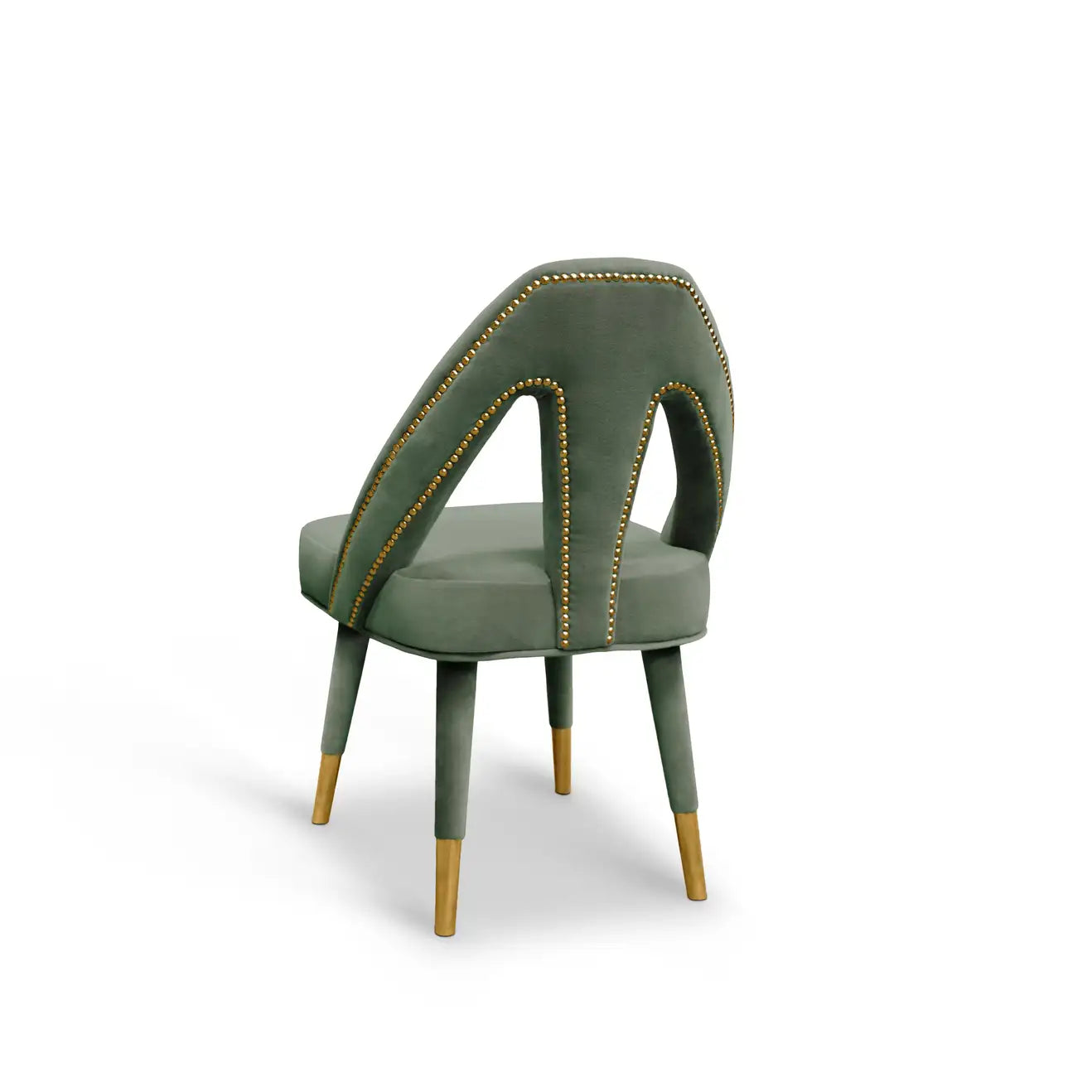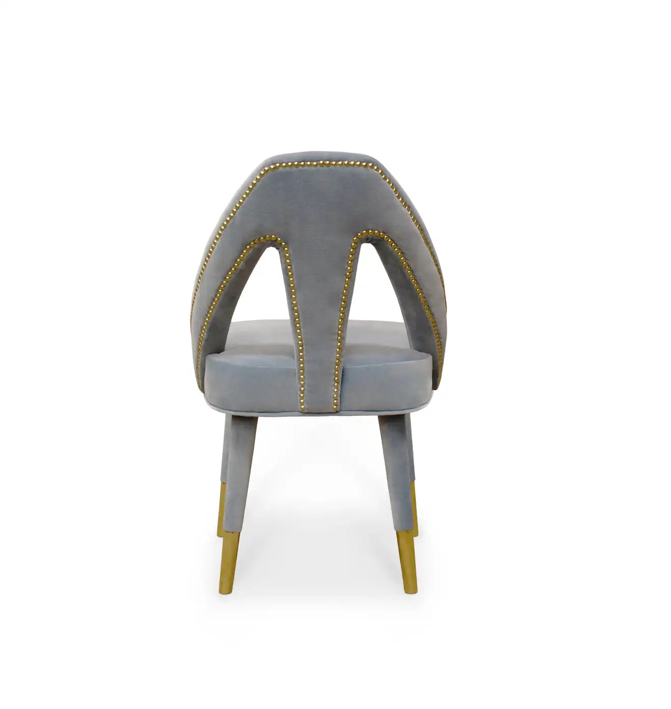 Inspired by Paris, the charming capital of lovers, the Caron Mid-Century Modern dining chair exhibits a fascinating and romantic design. Any contemporary living space will become a passion nest where seduction and love live an intense affair. This elegant piece is upholstered in sensual grey velvet, held by beechwood legs draped in velvet and polished chrome nails on the back. Its bewitching and soft lines are ideal for any modern décor
