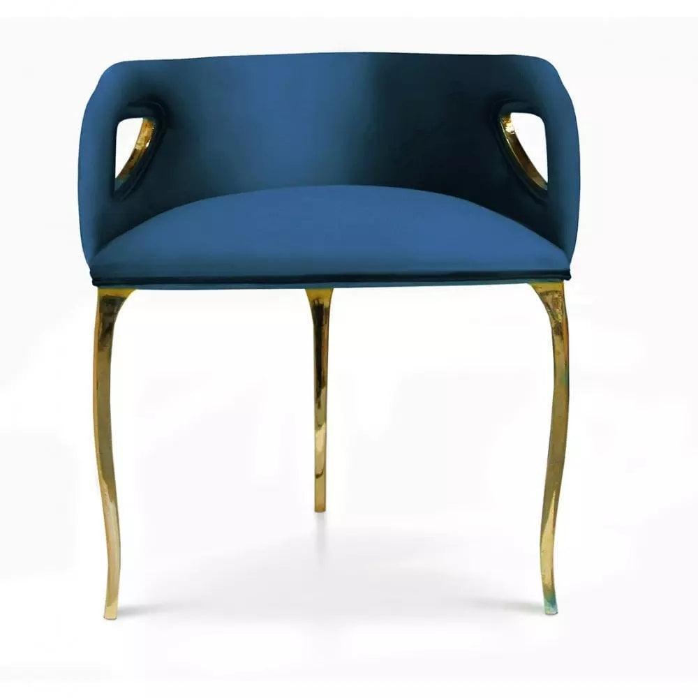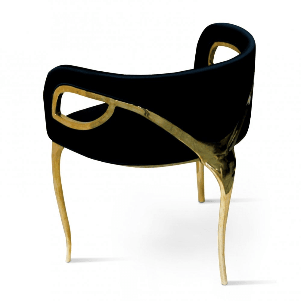 Chandra is both bold and daring. The modern edge in this chair exudes the feeling of vintage glam. While polished brass bands delicately bind the chair highlighting the sculpted fluidity of the tight back upholstery.