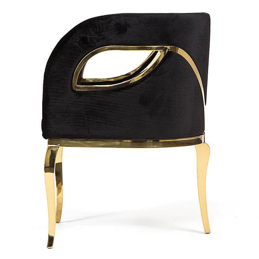 Chandra is both bold and daring. The modern edge in this dining chair exudes the feeling of vintage glam, while polished Brass metal bands delicately bind the chair highlighting the sculpted fluidity of the tight back upholstery.