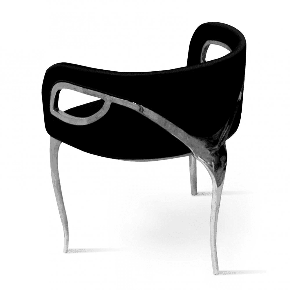 Chandra is both bold and daring. The modern edge in this chair exudes the feeling of vintage glam. While polished nickel bands delicately bind the chair highlighting the sculpted fluidity of the tight back velvet upholstery. Also available in Gold and chrome finish.