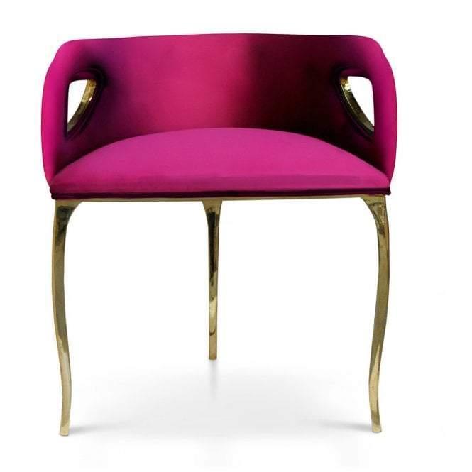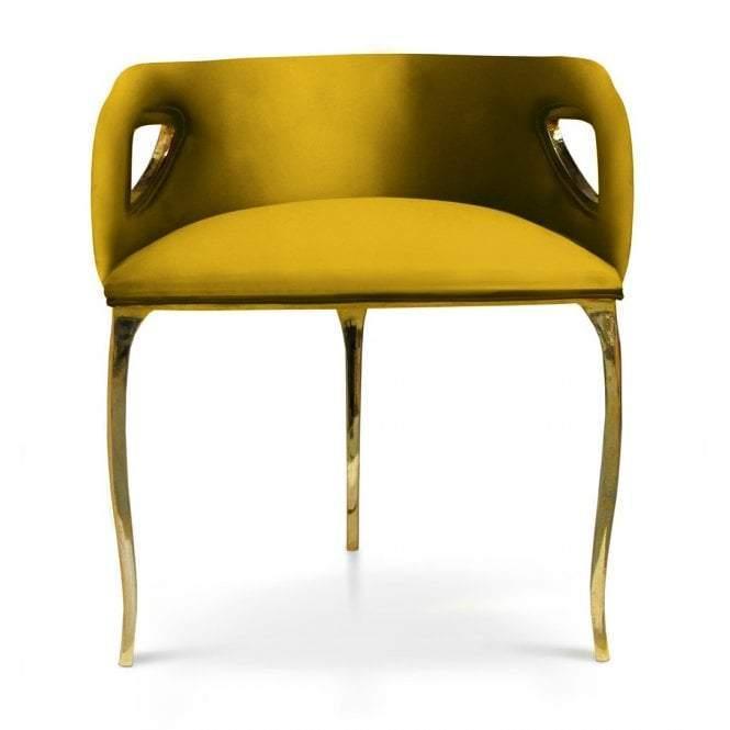 Chandra is both bold and daring. The modern edge in this chair exudes the feeling of vintage glam. While polished Brass bands delicately bind the chair highlighting the sculpted fluidity of the tight back upholstery.
