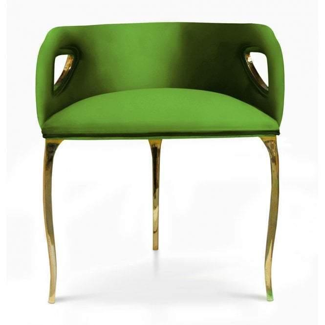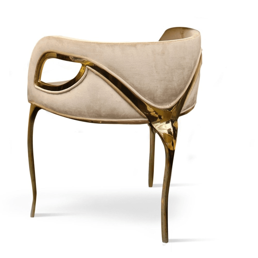 Chandra is both bold and daring. The modern edge in this chair exudes the feeling of vintage glam. While polished Brass bands delicately bind the chair highlighting the sculpted fluidity of the tight back upholstery.