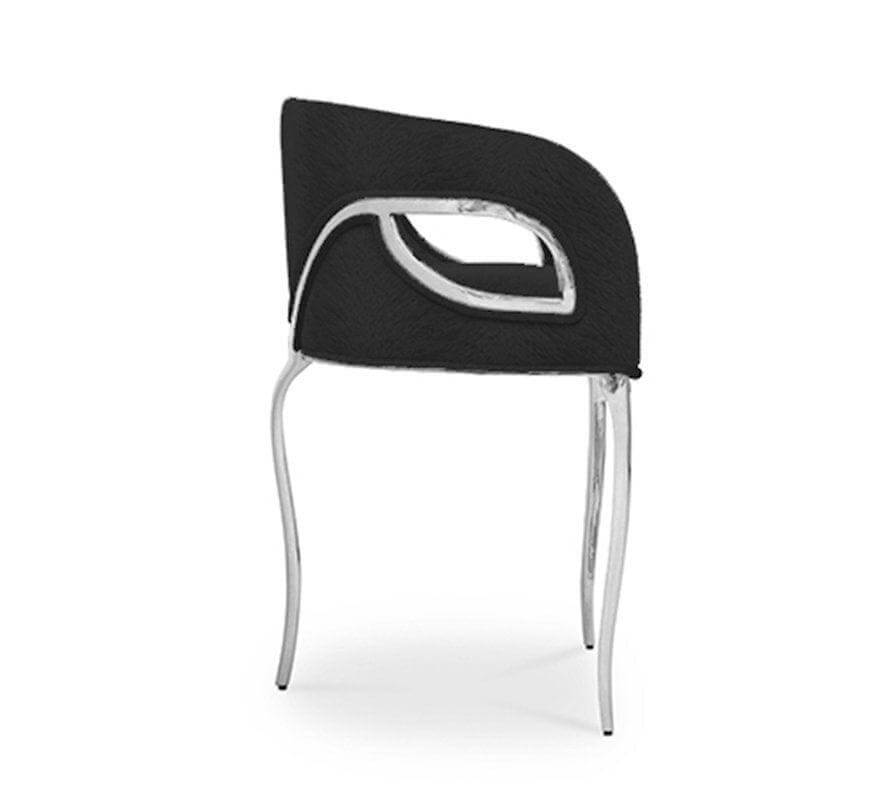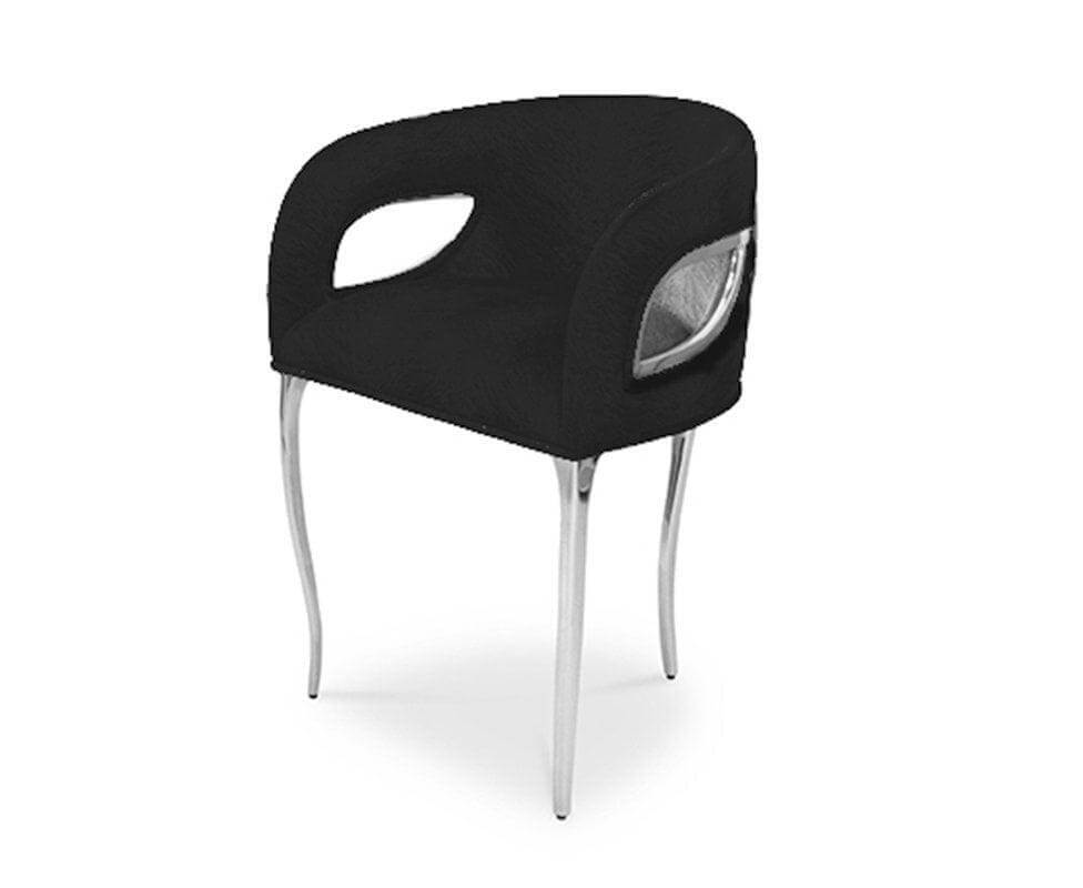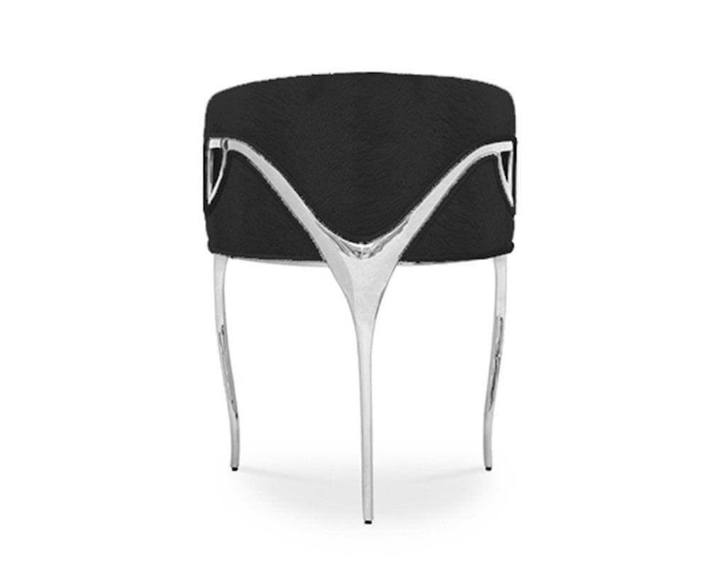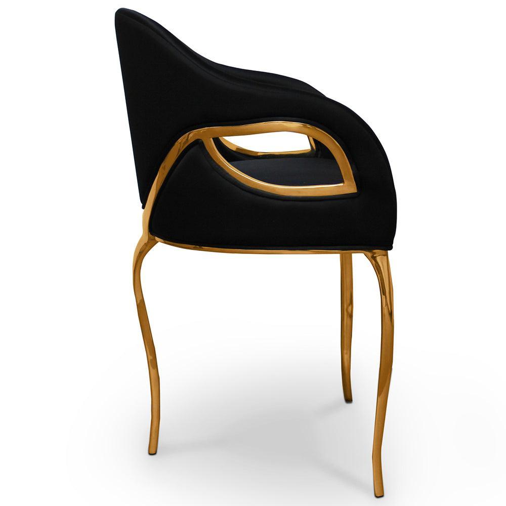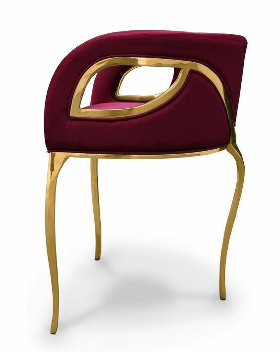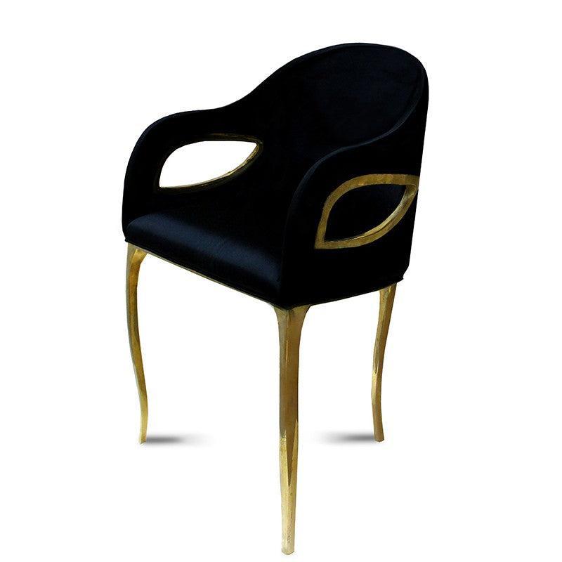 Chandra is both bold and daring. The modern edge in this dining chair exudes the feeling of vintage glam, while polished Brass metal bands delicately bind the chair highlighting the sculpted fluidity of the tight back upholstery.