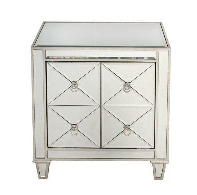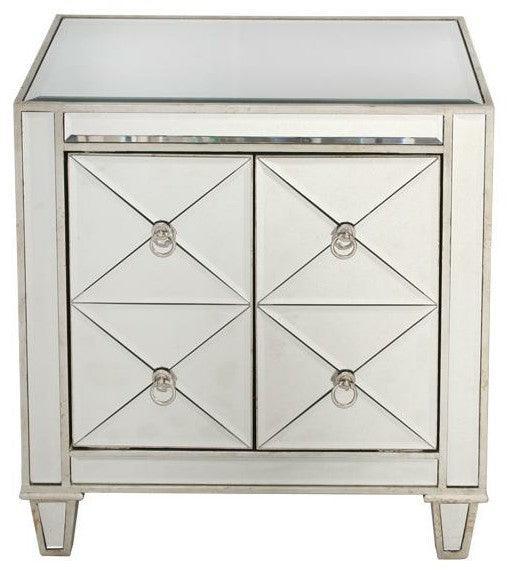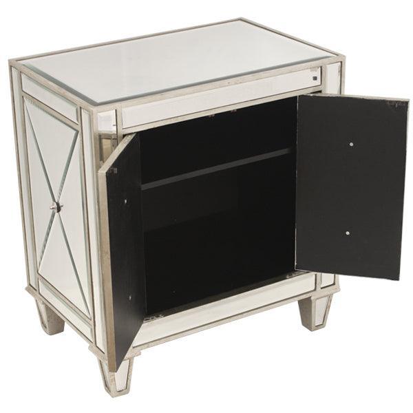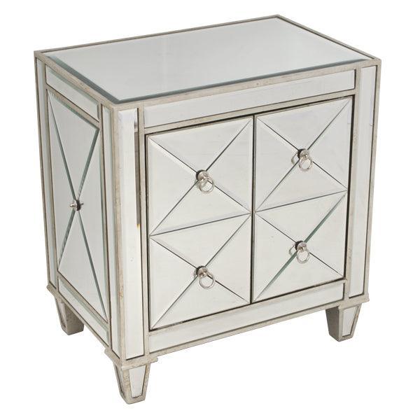 Stylish bedside with 2 doors and internal shelf. Elegant Mirrored Bedside Table bevelled mirror top and criss cross feature doors. Polished metal ring pull handles provide a contemporary look and feel to the piece. Take greater advantage of the reflective benefits of mirrors by incorporating a statement mirrored furniture piece. Our Mirror Bedside collection embraces the glamour of Hollywood and Art Deco inspiration. The nostalgic design features mirrored panels, with antiqued champagne mouldings and hardware. Keep the room restrained for a Manhattan style, or add a touch of Paris with French inspired furniture.