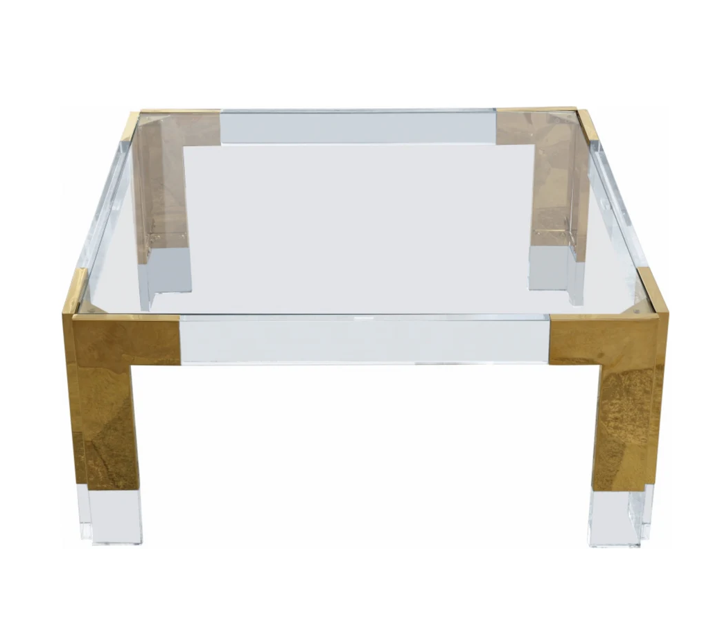 Count on this Cocktail square coffee table to rev up the contemporary look of your home. The beautiful clear glass top lets the beauty of the premium materials shine through. Clear acrylic feet and brass finish stainless steel accents lend the table a rich look. Insert this table in your living room, den, or family room to enjoy an attractively artistic spot to rest books, magazines, and beverages.