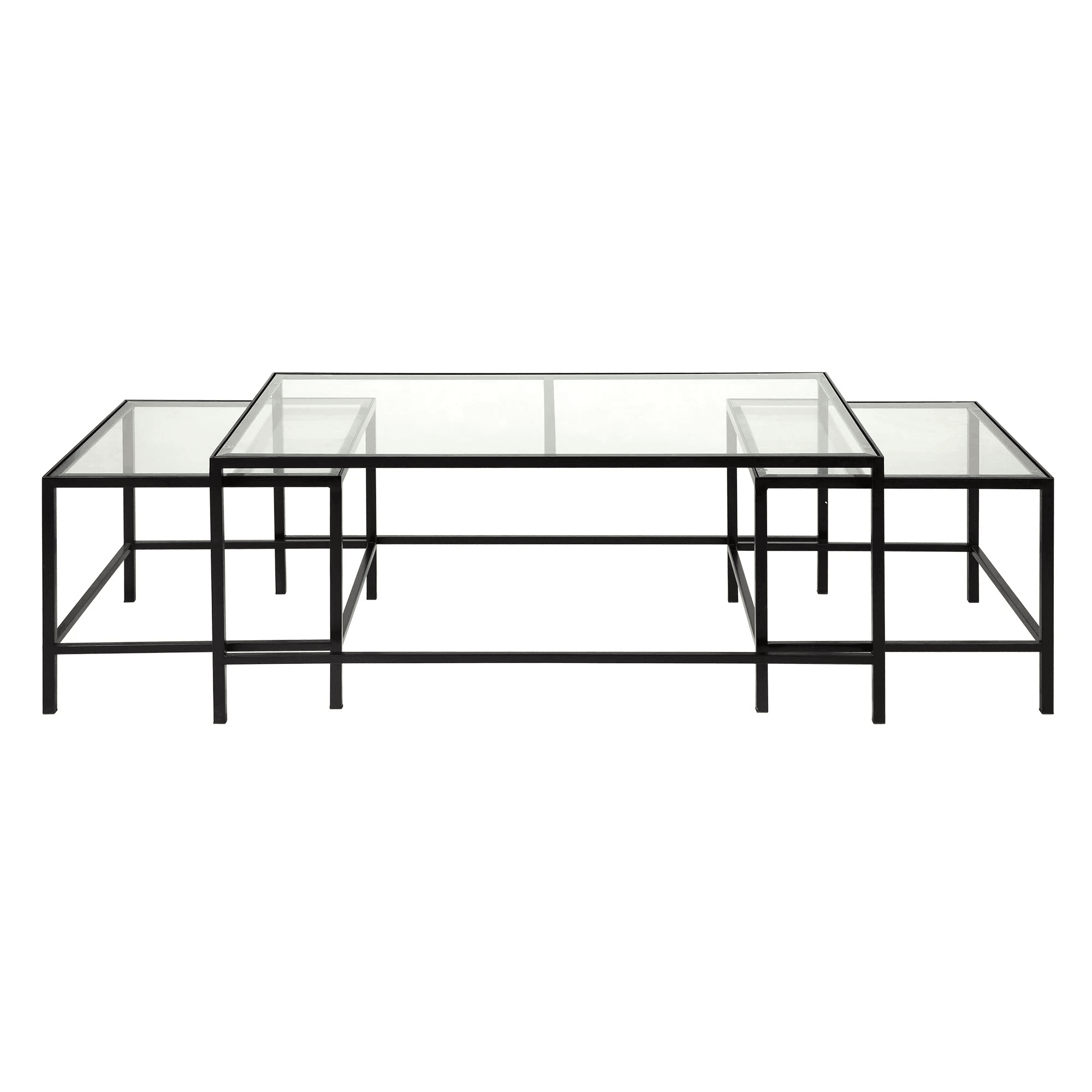 Cocktail Glass Black Nest Coffee Table. Brushed black stainless steel metal frame with three piece nested coffee table with clear tempered glass top with 2cm bevel