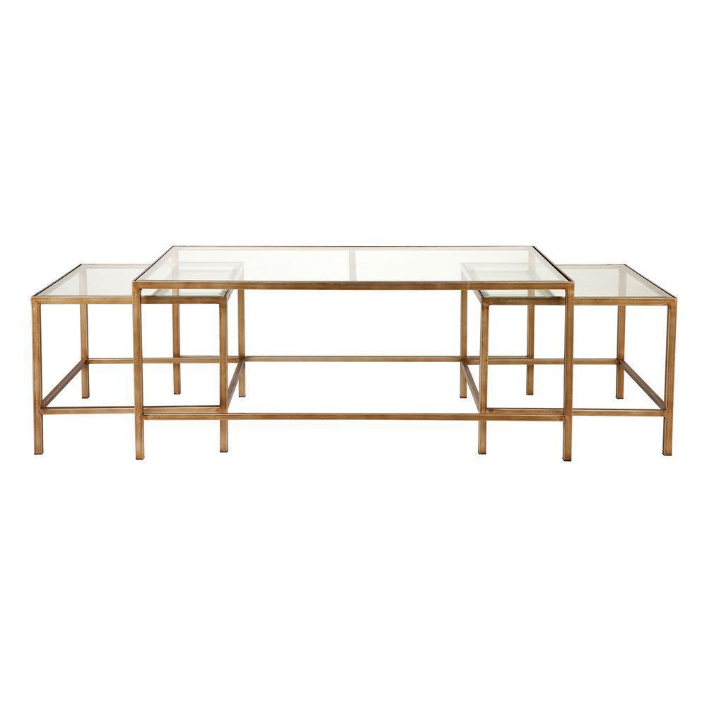 The Cocktail nesting coffee table is an elegant piece for a refined home with delicate proportions finished in an antique gold hand painted iron frame, accented by inlaid bevelled-edge glass. Both handsome and purposeful, it features two square tables nested under a centre rectangular table that allow practical flexibility in your living space whilst leaving a visually light footprint.